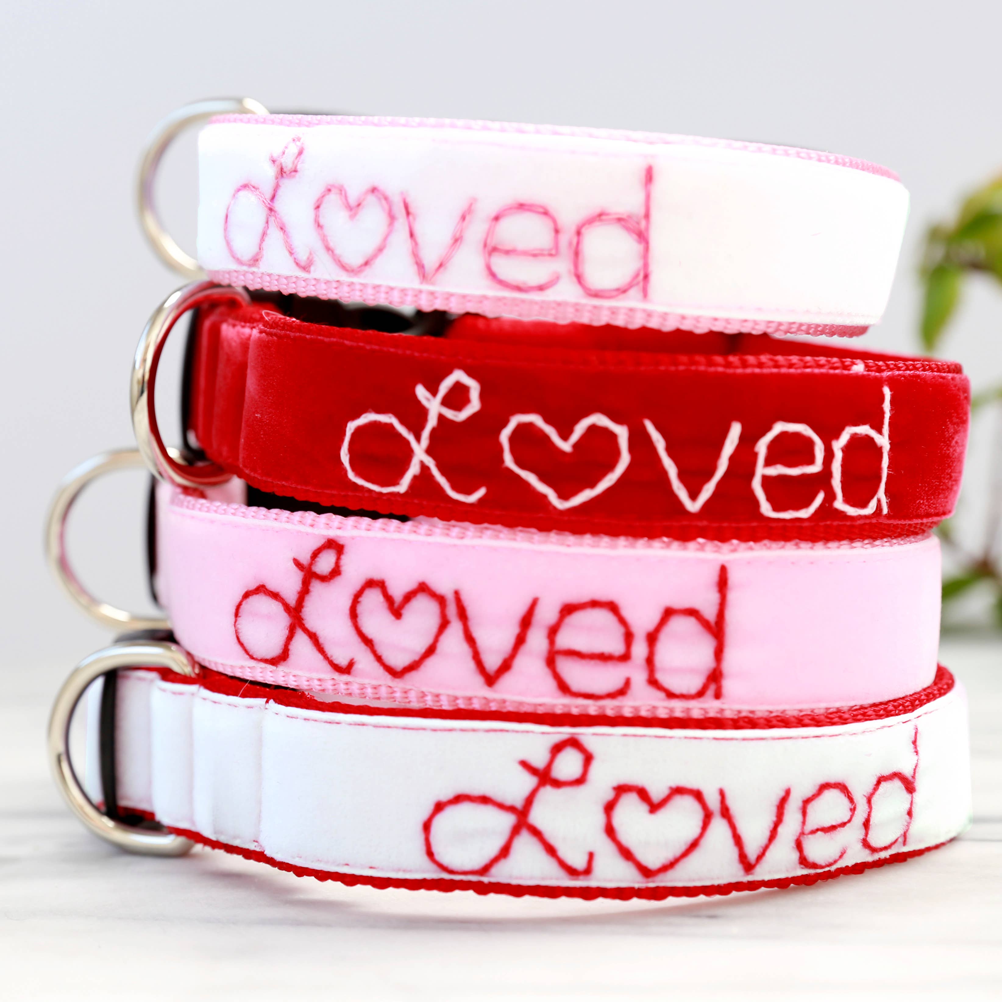 Just like our original webbing collars, but with hand embroidered flair on gorgeous velvet! You choose the color and tell us your customers dogs name, we make your dog this super cool personalized & custom, head turning dog collar! Please reach out to me about sizing questions prior to purchase, and let the customer know that the sizing range for these collars is smaller depending on the length of the name. *Please note this is a handmade item and no two will look exactly the same. Not suitable for dogs who are heavy scratchers/young puppies.* -Comes with black plastic buckle -Made with washable Swiss velvet so you can keep your pup’s hand-made dog collar in pristine condition -Made in the USA - Can add a heart to end of name, no other symbols. Matching leash in the shop!