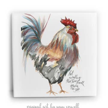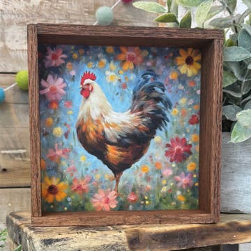 Our prints are ready-to-frame in a standard opening. Printed on heavyweight, bright-white, matte-finished paper for vivid colors - using ultra-chrome archival inks. Packaged in a clear cello bag with a backer board. The “Rooster” is an original design painted by Pam Coxwell. Price does not include frame.