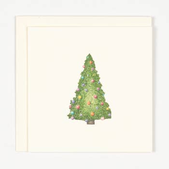 Our Festive Fir Tree Gift Enclosure is printed and hand-glittered in Memphis, TN. Hand crafted artwork, full color ink printed on natural white paper, hand-glittered, and paired with a vellum envelope. Book-folded enclosure card, blank on the inside. Paper color | natural white. Envelope color | vellum. Print process | full color + letterpress Embellishment | hand-glittered + gold foil Dimensions | 3 x 3 inches.