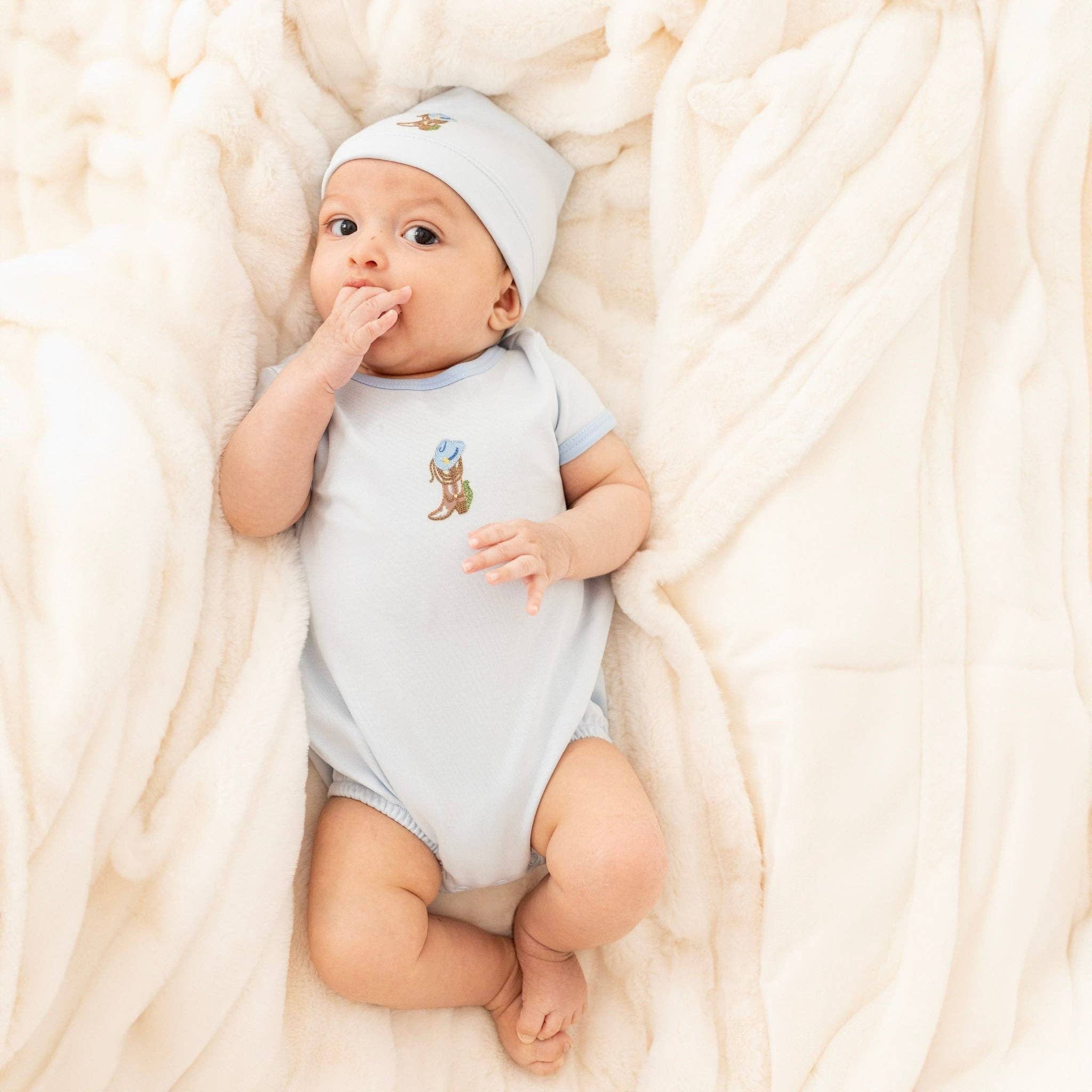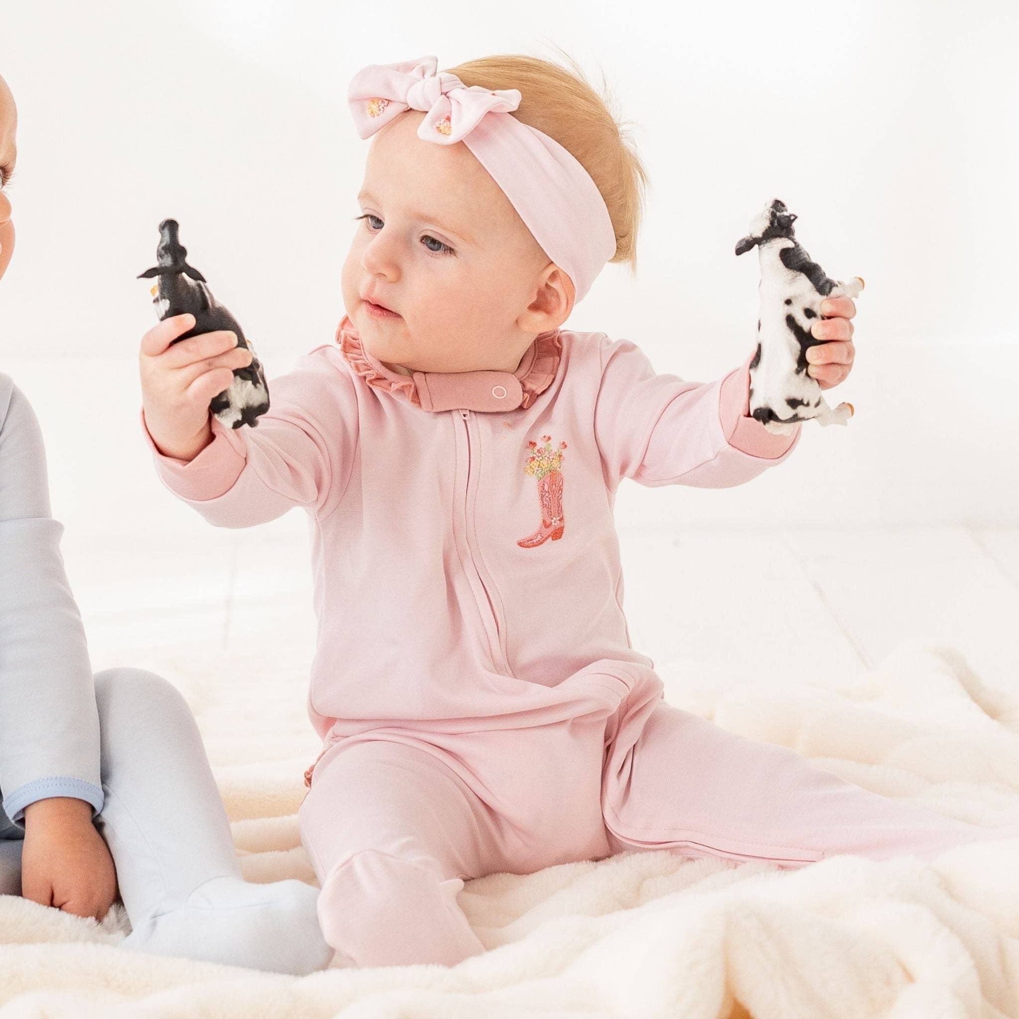 Luna & Arlo Boots and Blooms Bubble - Pink Wrap your little darling in the simple sweetness and playful charm of the "Boots and Blooms" collection with this cozy luxurious Pima Cotton bubble from Luna & Arlo. The beautiful pink fabric features a delightful embroidered cowboy boot blooming with spring and summer flowers on the chest, accented by sweet ruffles on the short flutter sleeves and around the leg openings. Features: • 100% Pima Cotton: Ensures baby's delicate skin feels comfortable and nurtured. • Playful Embroidered Accent: Features a delightful cowboy boot with floral details. • Sweet Flutter Sleeves with Ruffles: Delicate ruffles on the short flutter sleeves. • Ruffled Leg Openings: Feature charming ruffles for an extra touch of sweetness. • Easy Care: Machine washable for hassle-free cleaning. Benefits: • Sweet Details: Ruffles on the sleeves and leg openings add a charming touch. • Perfect for Warm Weather: Sleeveless style and lightweight fabric. • Mix and Match: Coordinates with other items from the "Boots and Blooms" collection. Enjoy simple sweetness and playful charm for warmer days! Explore the Luna & Arlo "Boots and Blooms" collection now!