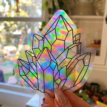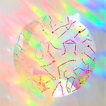 Prismatic rainbow decal with original artwork. Place inside your sunniest room to create happy rainbows! This decal measures 4"x4" and can be repositioned and removed leaving no residue. Decal comes packaged in compostable plastic, with paper insert description of what it is and how to use it.