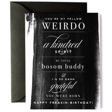 Celebrate your weirdest, best friend with Kitty Meow's "Bosom Buddy" funny birthday greeting card! This heartfelt yet humorous card honors the special bond between kindred spirits who totally get each other. Perfect for retailers stocking best friend birthday cards, funny friendship greetings, or sentimental cards with personality. Your customers want to tell their best friends they're grateful for their existence, and this card expresses that with humor and heart. 💕 Heartfelt friendship message - "You're my fellow weirdo, a kindred spirit, my total bosom buddy, and I'm so damn grateful you were born. Happy freakin birthday" captures real friendship 👯 Perfect for best friends - Ideal for ride or die friends, soul sisters, besties, or lifelong companions 🖤 Black envelope included - Comes with a black A2 envelope for sleek presentation 📏 Standard greeting card size - 4.25" x 5.5" folded card pairs beautifully with birthday gifts ✍️ Blank inside - Space for inside jokes, memories, or more expressions of friendship love This funny birthday card works for milestone birthdays, everyday celebrations, or friendship anniversary moments. Blank inside provides room for personal touches. Perfect for boutiques, bookstores, gift shops, and retailers serving customers seeking unique best friend birthday cards. Great for celebrating the weirdos, misfits, kindred spirits, and soul sisters who make life better. Popular year round for birthday celebrations between true friends. Birthday love for the friends who are basically family!