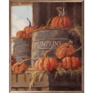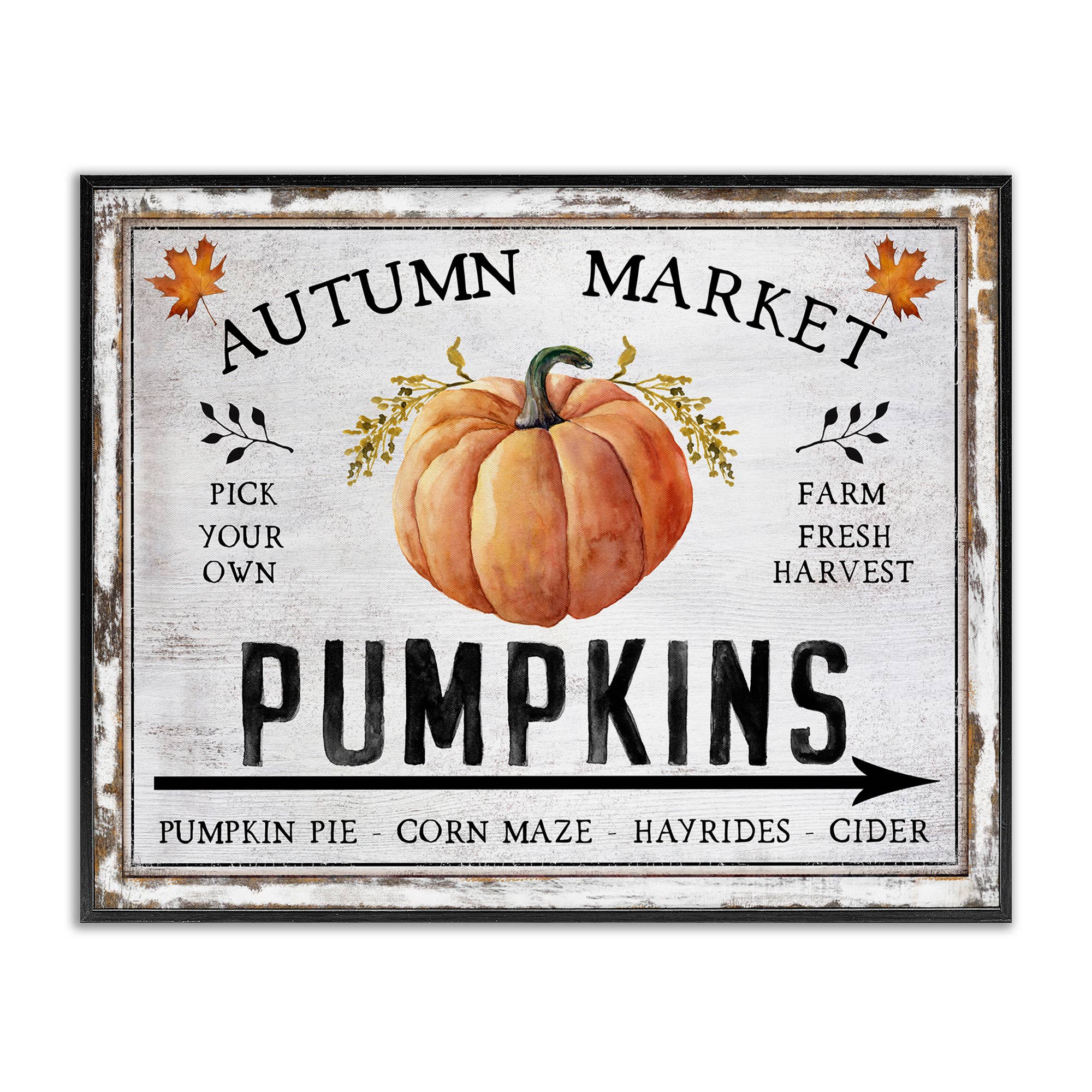 Invite autumn in with this nostalgic Pumpkin Patch canvas featuring chalkboard-style lettering and whimsical vintage charm. Aged black backdrop with white distressing makes the bold typography pop, with fall favorites like “corn maze,” “apple cider,” and “pumpkin pie” calling to mind crisp air and cozy sweaters. Design and faux frame are printed on smooth canvas (not real wood or metal). Perfect above a hutch, coffee bar, or market display. A wonderful addition for boutiques, fall festivals, farmhouse lovers, and anyone curating warm seasonal moments. Available in a variety of sizes and price points to fit your boutique’s display needs and customer budgets. Arrives ready to hang with sawtooth hardware pre-installed. Made to order in the USA and ships in 3–5 business days.