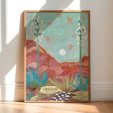 Limited edition giclée print by Denver artist Dolan Geiman. Each print is a detailed reproduction of an original Geiman paper collage printed on matte art paper, signed and numbered. Each original paper collage was constructed from reclaimed, upcycled materials. *Sizes: 15.5 x 26 || 24 x 42 || 32 x 56 *Packaging: small unframed prints are packaged in a sealed plastic sleeve with foam core backing || medium and large unframed prints ship rolled inside their own individual kraft tube with end-cap labeled (see photos) *Hangers: search product Print Hanger | Magnetic | Walnut for walnut hanger product details. *Shipping: Unframed prints ship in 1-3 days. Southwest style roadrunner art, roadrunner art, desert gift, cactus prints, bird prints. Western Art, Large wall art.