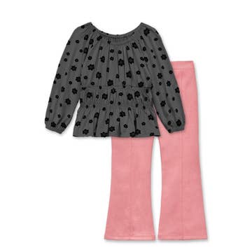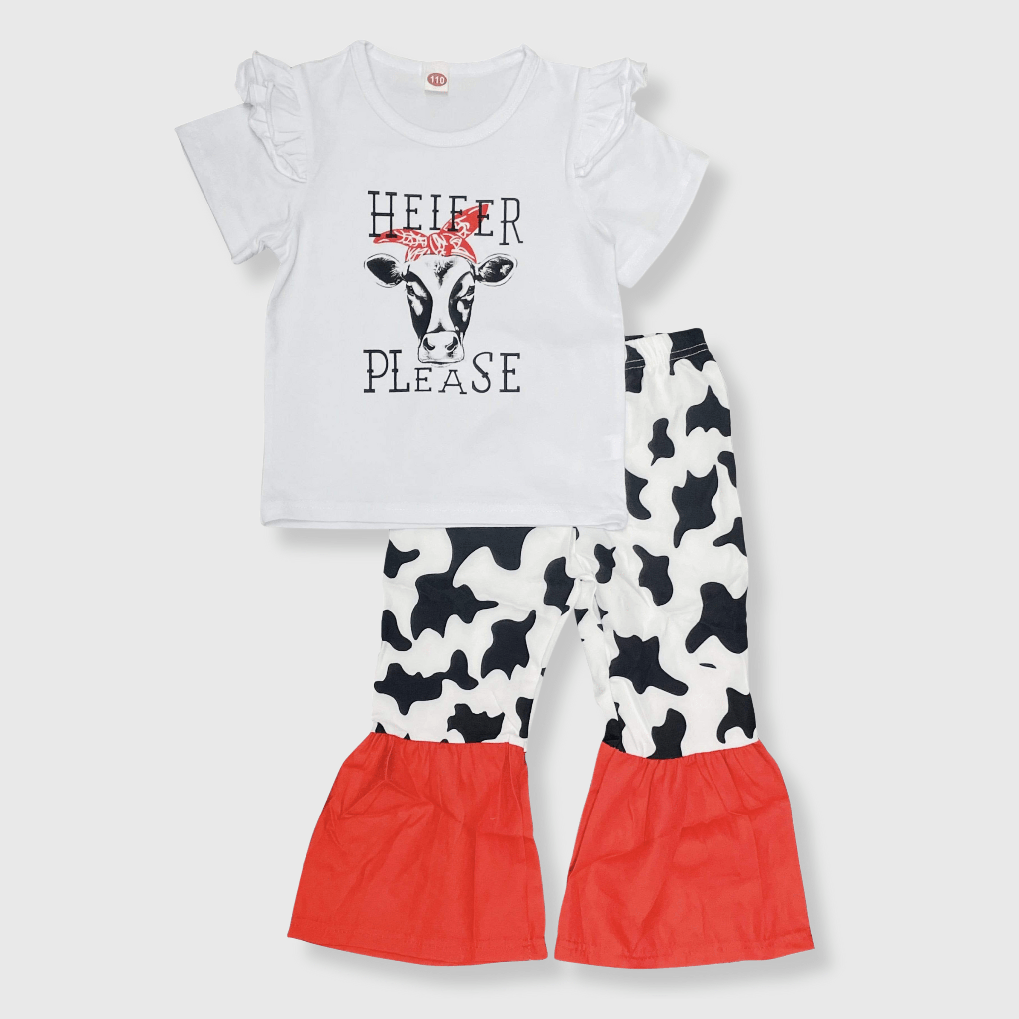 Moooo Cow print is now available in our super popular flare bell bottom pants! This set is a classic cow print and is so adorable paired with our ruffled long sleeve top. Let your littles ones western farm love shine!