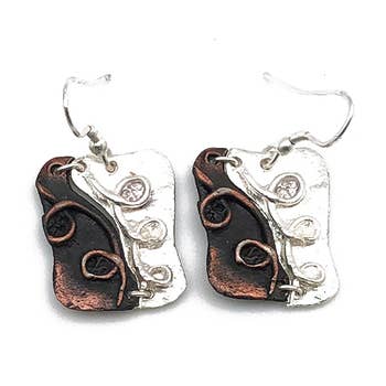 -Hand cut and finished copper blanks that are then flame painted with a torch -Sealed to keep the finish -Ear wires are stainless steel. -2 1/4" in length and 1 1/8" in width -Light weight -Each pair of earrings will look similar to the above pictured pair, but will vary slightly in color and pattern due to dealing with torch