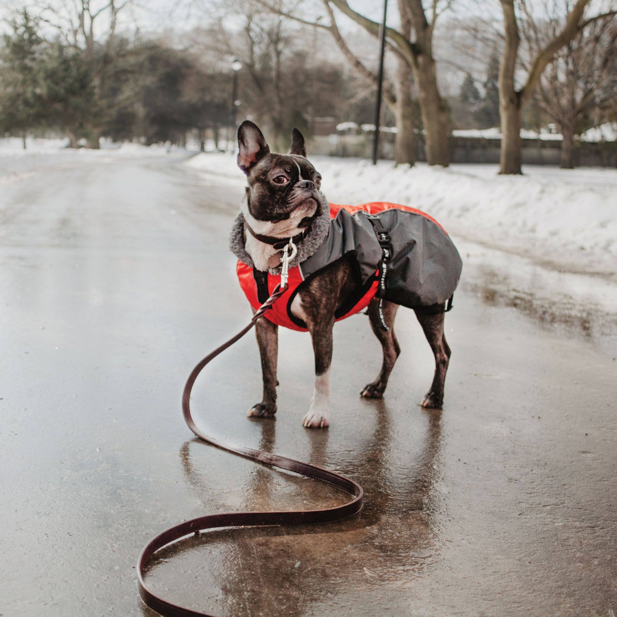 Easy on-and-off! Featuring a wind and water-resistant 300 denier outer shell, 200 gram polyfill and a cozy 340g fleece lining, the Tundra Coat is a functional choice for all sorts of winter weather. Made with adjustable chest and belly band closures for a customized fit, and stretchy, adjustable leg straps to help keep the coat in place. Provides superior side hind coverage down to the thighs of most breeds. Reflective piping offers enhanced visibility on nighttime walks.