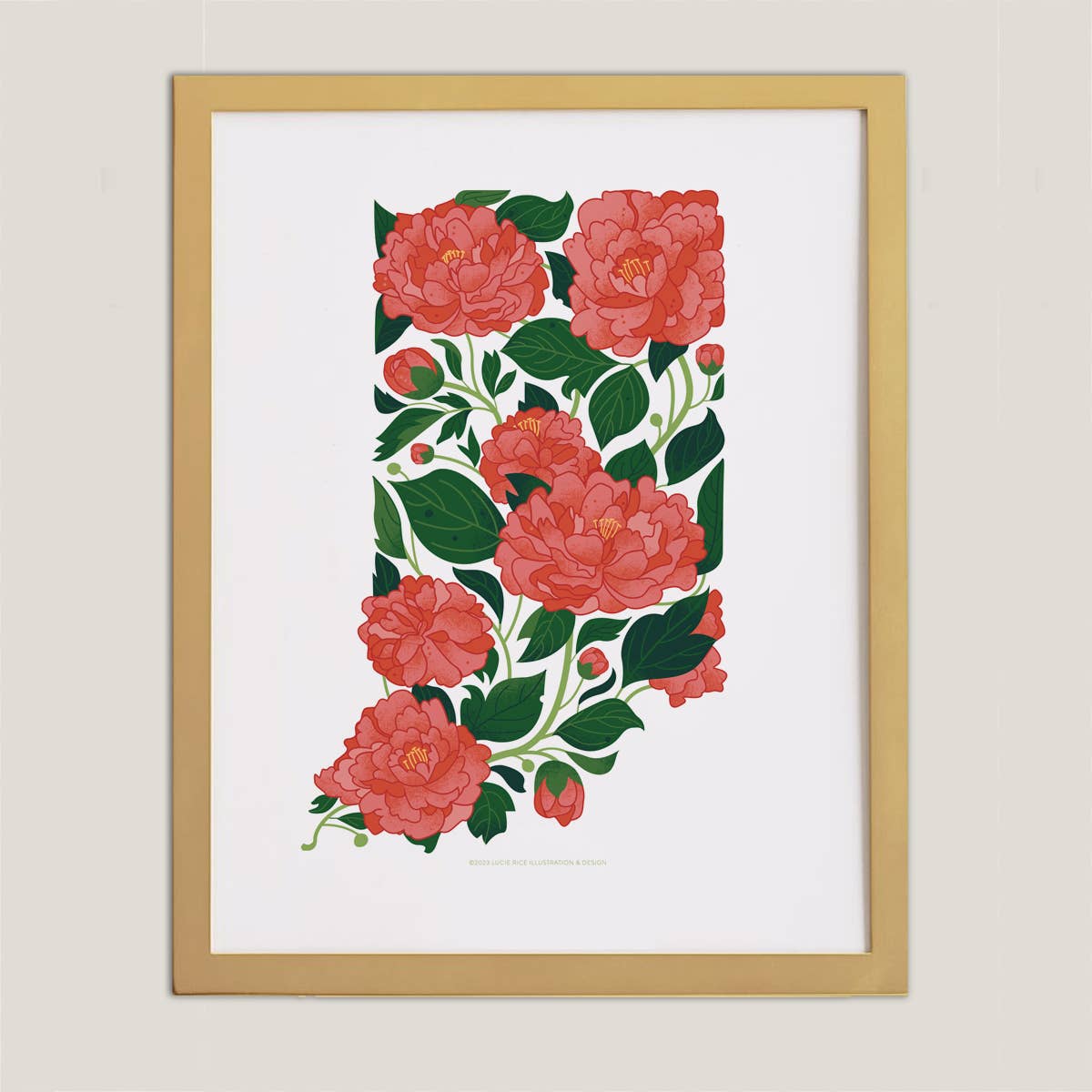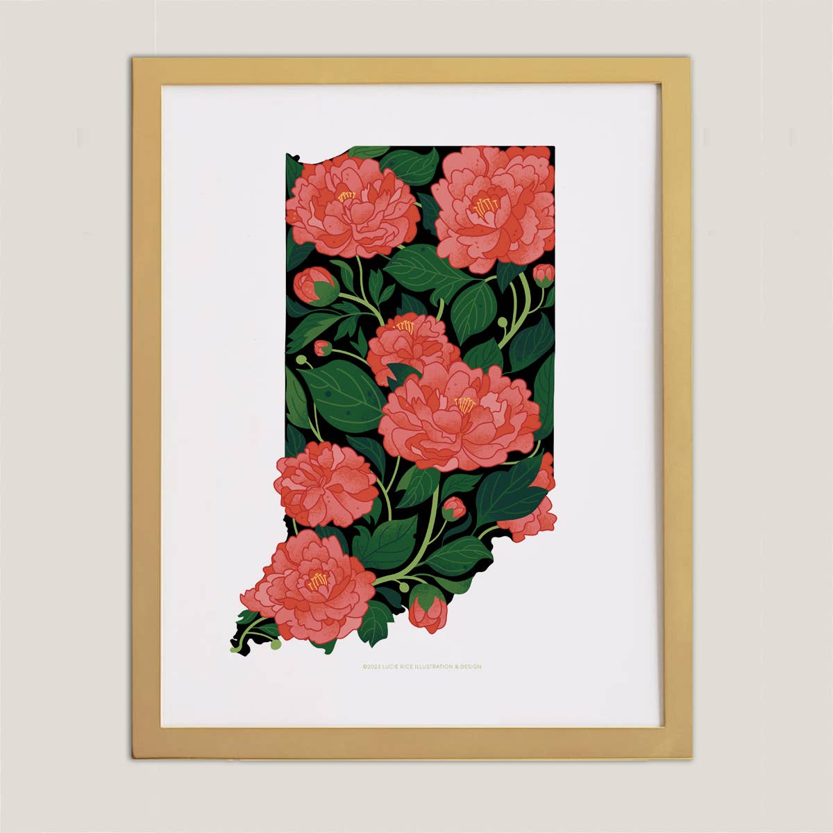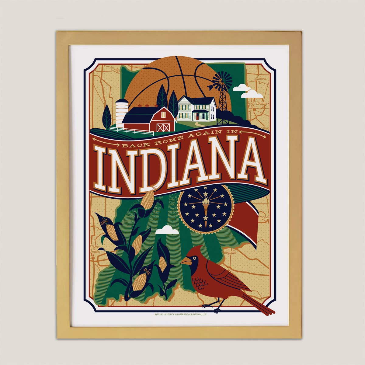 This illustration celebrates the great city of Indianapolis, Indiana and features iconic landmarks, natural beauty and state symbolism. This piece is printed on a heavy coated card stock that reproduces color beautifully and comes in a clear protective sleeve with backing board. The size is standard for "off the rack" frames.