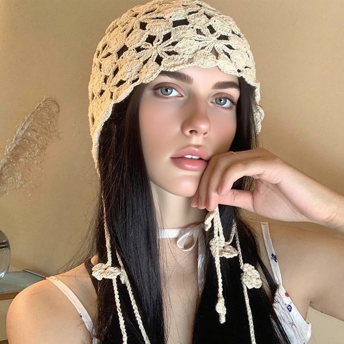 Wholesale Colorful 3D Vintage Hollow-Out Boho Floral Crochet Beanie