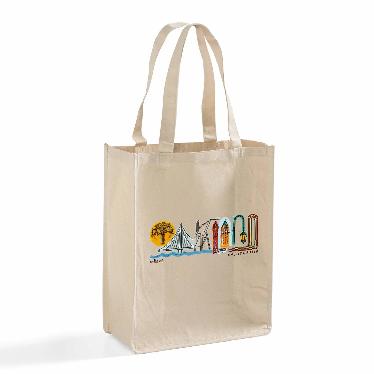 "Canvas tote. It is 100% cotton and machine washable. Size: 15.75"" x 15.25"". It is made in USA."