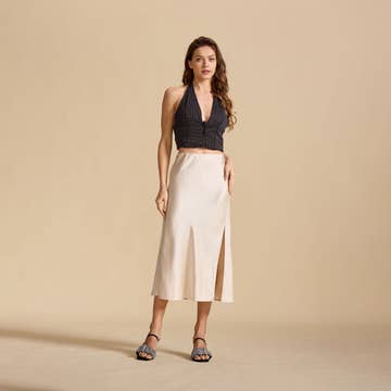 The Helen Skirt is a woven linen-blend skirt that features a high waist, back slit and a clean, crisp look. Lined for added comfort. Pair with crop tops for warm spring/summer days out.