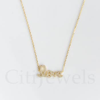 14K Gold and Sterling Vermeil Treasure crystal encrusted nameplate necklace, in 14K gold vermeil and sterling silver, on 16 by 18 inch chain. Your purchase will arrive on our custom You are my Treasure easel back card.