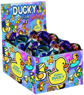 Easy to merchandise 60 Piece Counter Display Rubber Ducky branded- Cute And fun Rubber Duck Toys that you can play with everywhere! Kids love them, teens love em. Collect them all. 60 count display. Includes variety of glow in the dark ducks, glitter ducks, and metallic ducks.