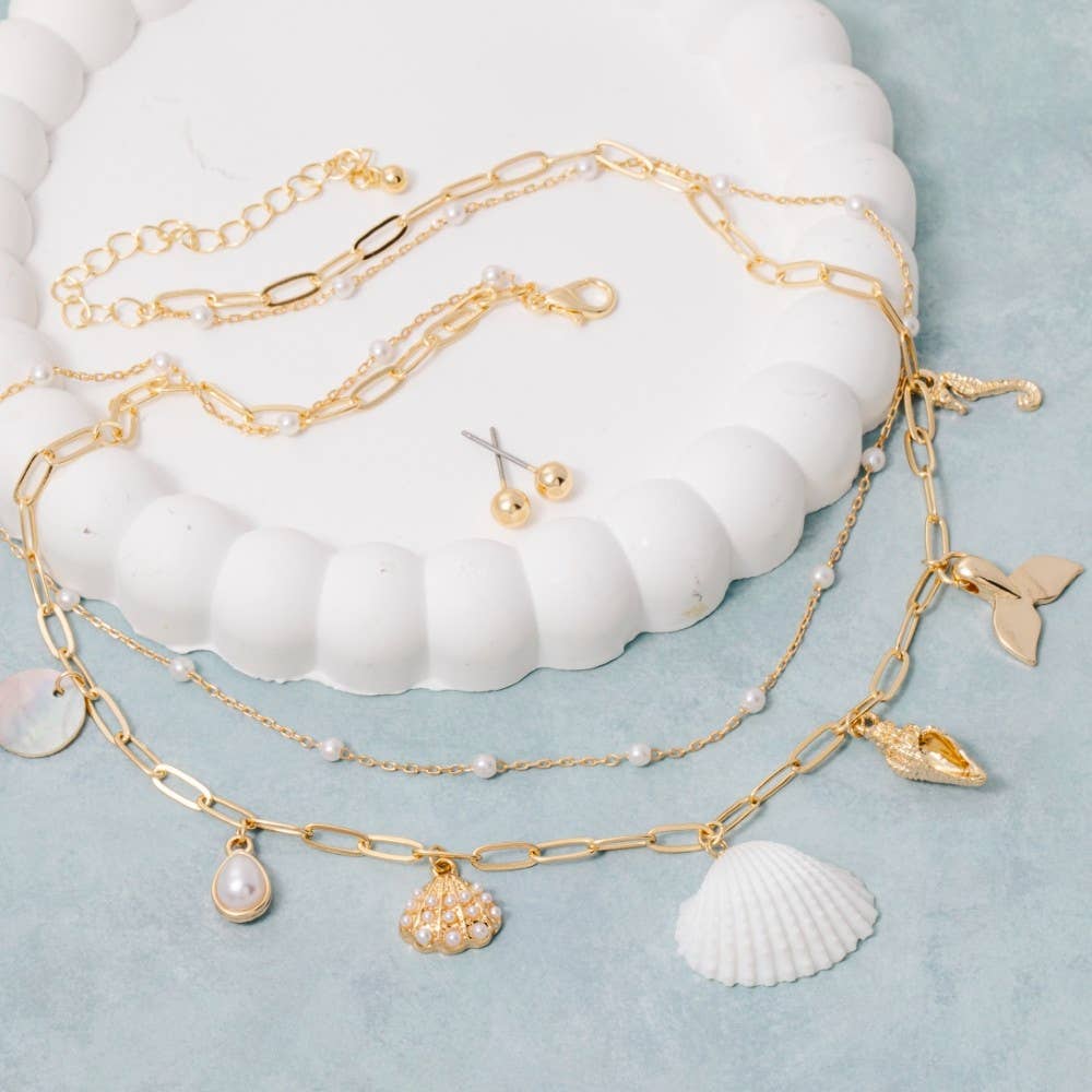 Engraved Heart Locket Pearl Beads Layered Necklace