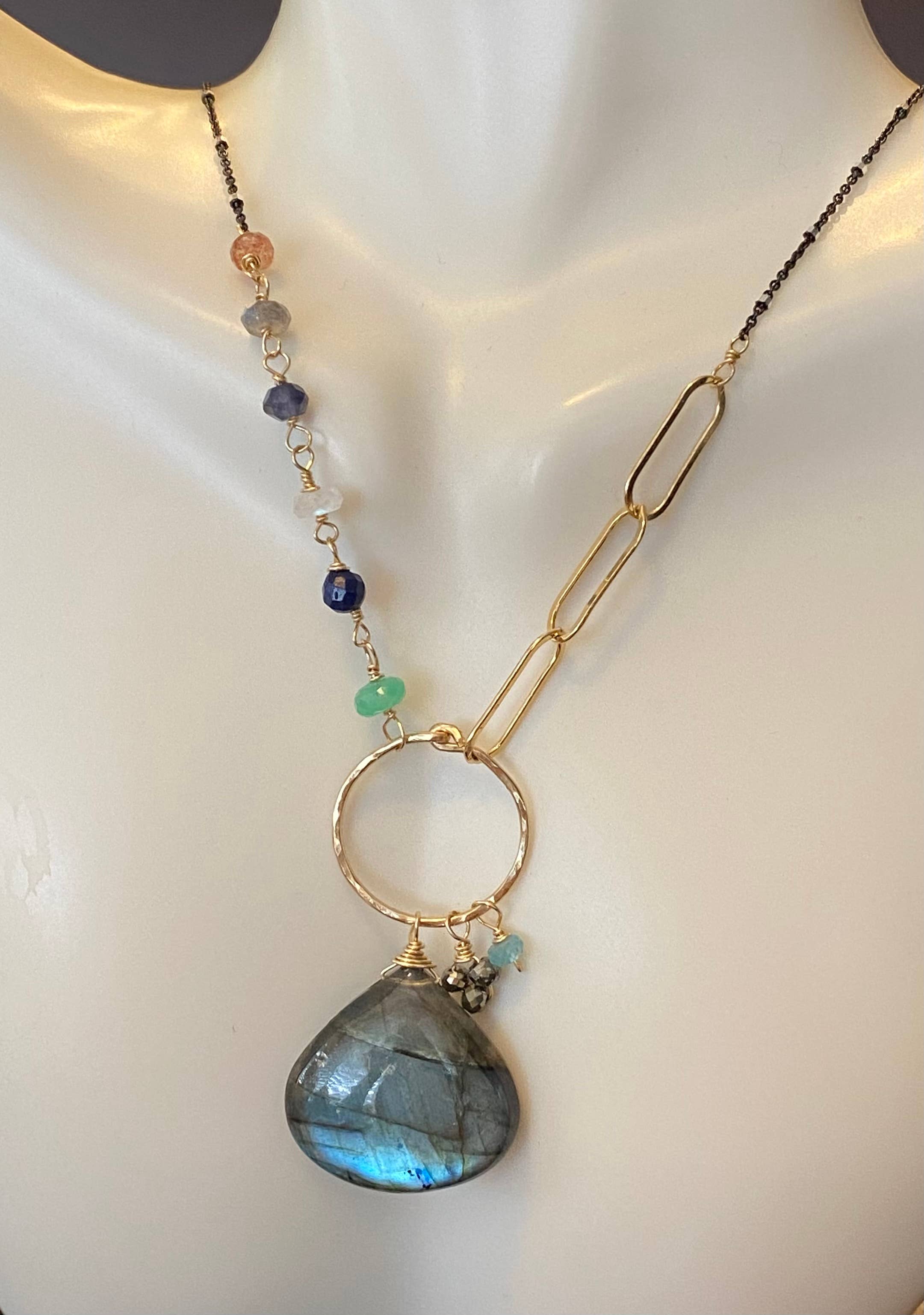 Moonstone, champagne quartz, lemon quartz, yellow aqua marine, labradorite and pyrite cluster in 14kt gf