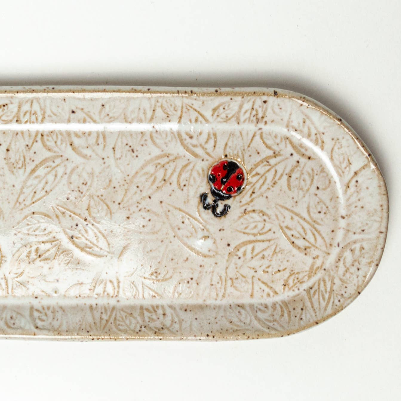 This beautiful stoneware ceramic platter features a white horse pattern and is hand-built and hand-glazed in Oberlin, Ohio, USA. Measuring approximately 12" long by 4" wide, it’s perfectly sized for serving bread, appetizers, or desserts, while also making a striking decorative piece. Food, dishwasher, and microwave safe, it’s crafted for both everyday use and special gatherings. Since every platter is individually handmade, no two will ever be exactly alike—subtle variations in glaze, color, and form make each one truly unique.