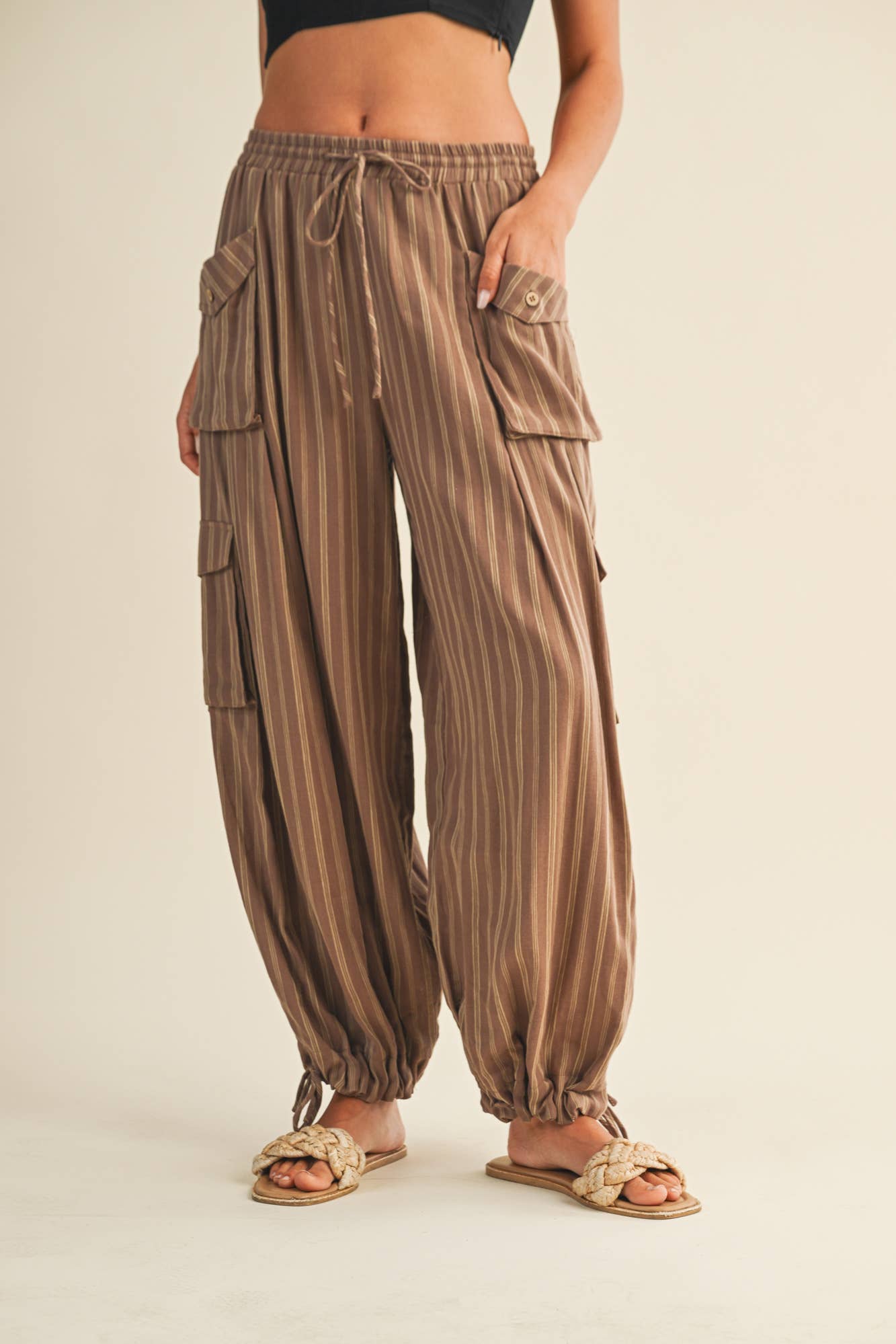 STRIPED SMOCKED BOHO COTTON GAUZE PANTS - WIDE-LEG PANTS - SMOCKED ELASTICIZED WAISTBAND - FUNCTIONAL SIDE POCKETS - LOOSE AND FLOWY FIT 100% COTTON