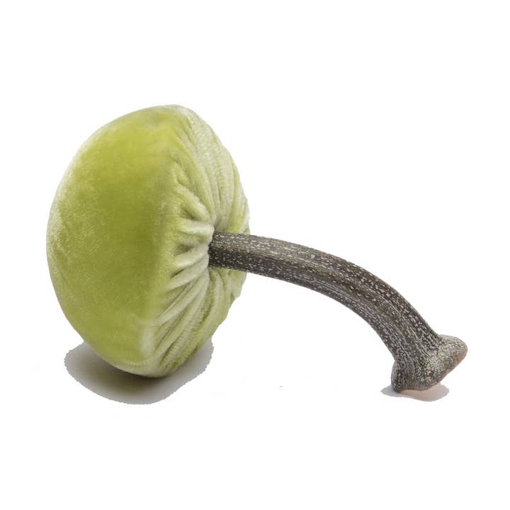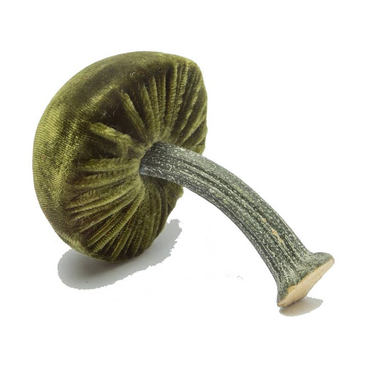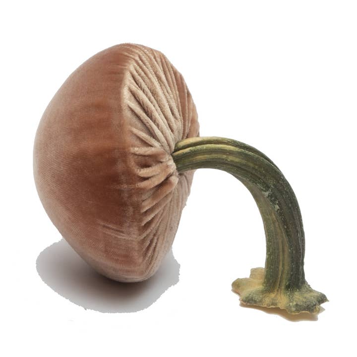 Silk velvet mushroom finished with a natural pumpkin stem. Handmade in Oregon by a Hot Skwash artisan. Each piece is hand signed in gold. approximately 3" cap