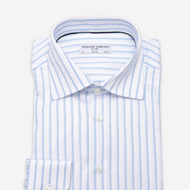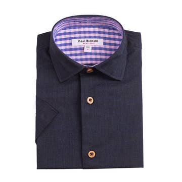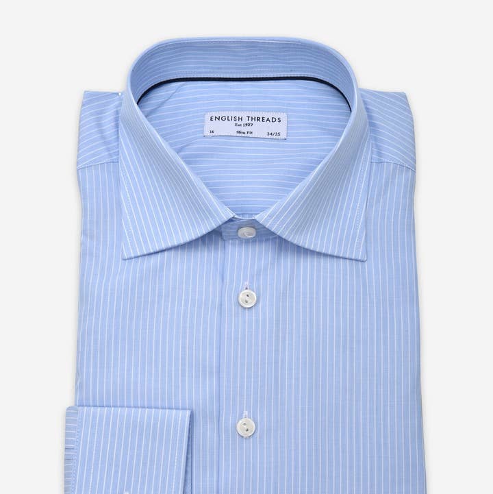 Contemporary fit. Yarn spun to a super fine 70's singles. Pre-shrunk. Cutaway collar - with contrast piping. Convertible cuffs - buttons or cuff links.