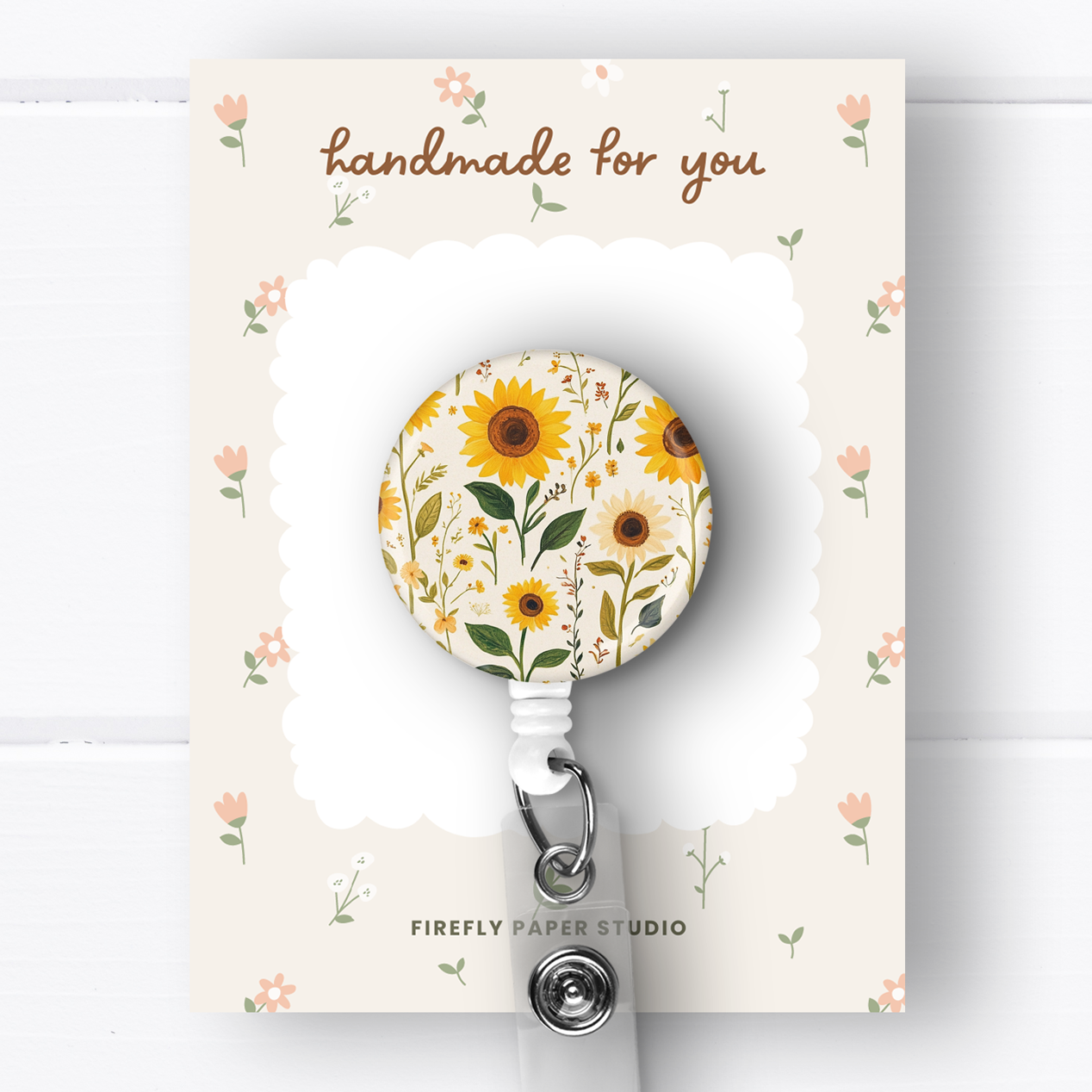 -White retractable badge reel -Alligator swivel clip -Extends up to 30" long -1.5" wide Mylar button is attached to the front -Badge reel will come packaged in an organza bag (see photo)