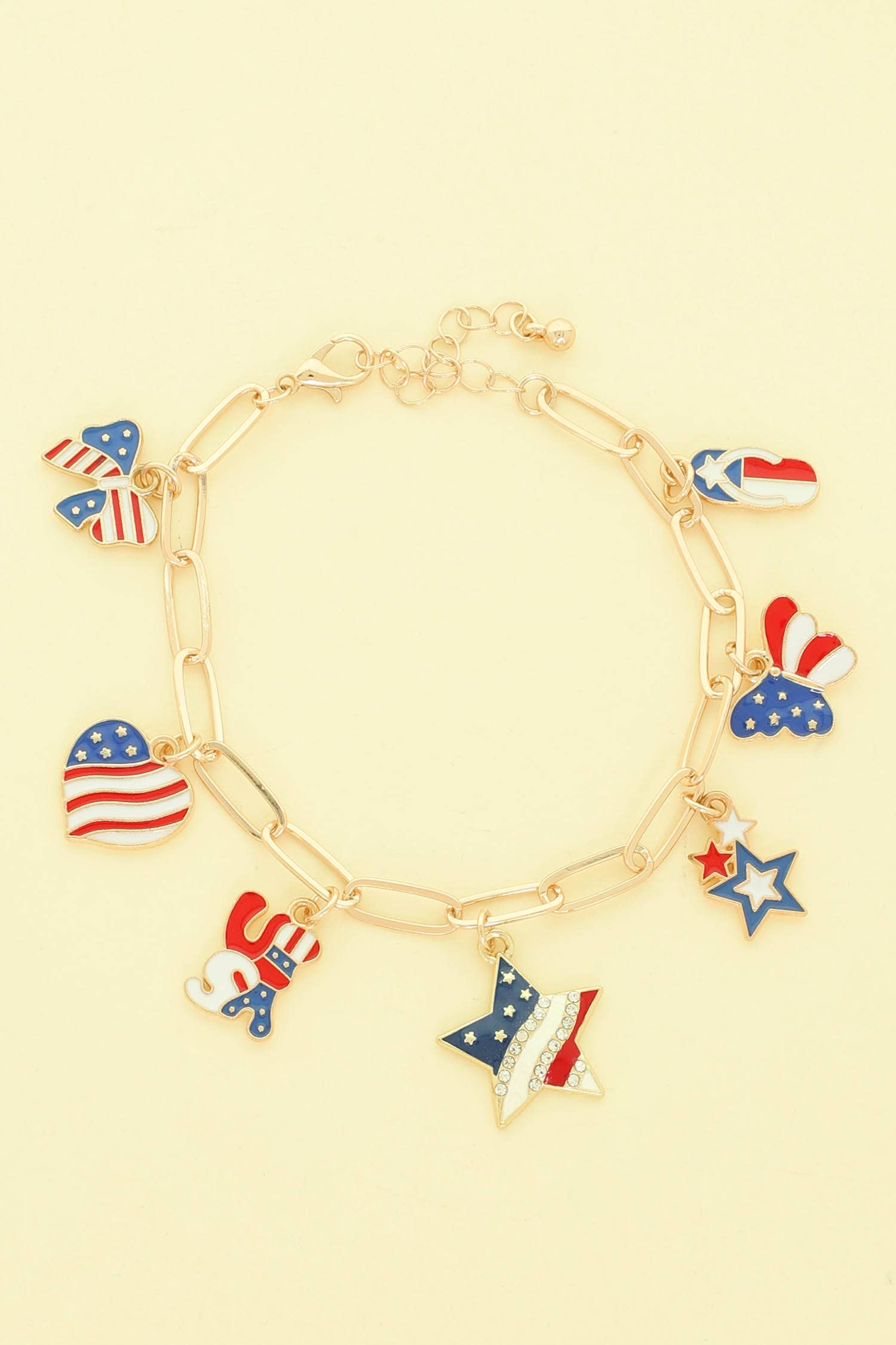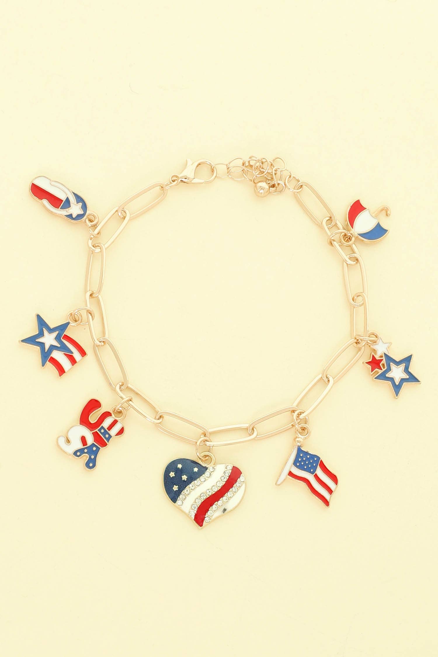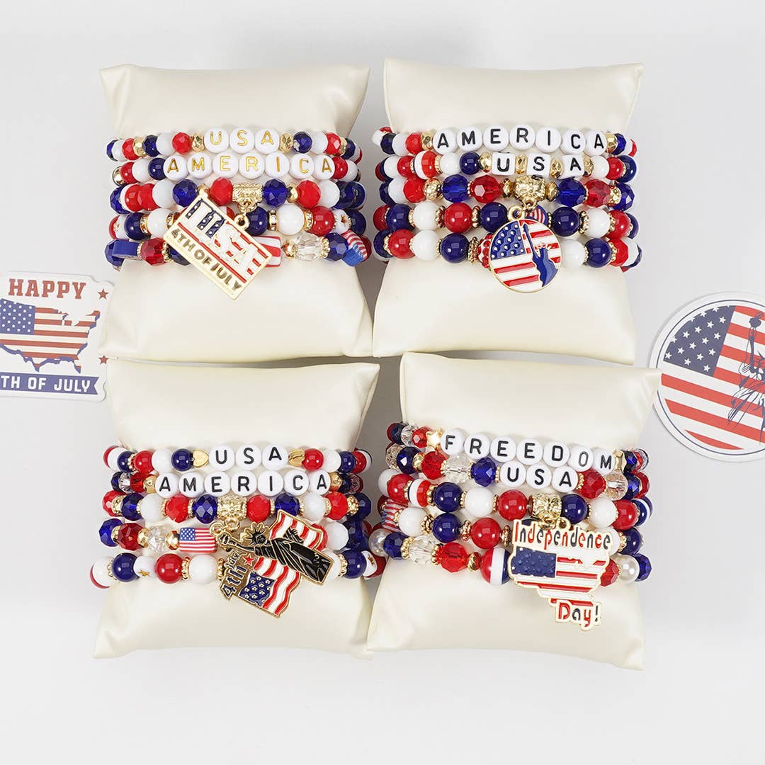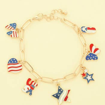 • Size : 1.5" H, 7" + 1" L • Lobster Clasp Closure • Patriotic themed charm bracelet featuring iconic symbols, heart accents, and decorative beads inspired by national pride. Designed to celebrate heritage and festive spirit, this statement accessory is perfect for holidays, gifting, events, or adding a bold touch to everyday bracelet stacks. • Lead and Nickel Compliant