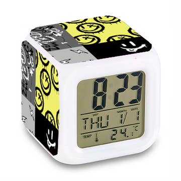 - Cube-shaped children’s alarm clock with 5 brightly coloured magnet animals and their corresponding sounds - Nature recordings of real animals:rooster, cat, dog, pig, and elephant - Activate the alarm by placing an animal on top of the clock. The other 4 animals stay fast asleep in their “homes” - “Wake up happy” function features sound that grow louder in three steps. Press the button at front to light the clockface and also snooze the alarm - Made of MDF wood, batteries: 3xAAA not included