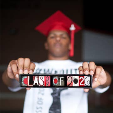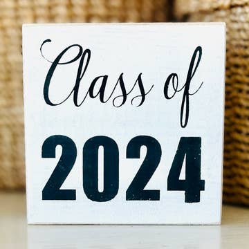 These wooden Class of 2026 signs feature my original photo letter art in your choice of four color schemes. They are THE top-seller in my online shop, and are multi-purpose. 1. Senior Photography Prop 2. Graduation Gift 3. Graduation Party Decor 4. Forever Memento Features My original letter photography Handmade of Pine Wood by us, from start to finish My original letter collage is permanently affixed on the painted wood Two protective finish coats over the top No glass used for a durable, unique, shatter-proof piece Perfect for accents and gifts Small : 9.25 x 1.5 inches. Can stand alone / no metal hanger. Medium : 10.5 x 2 inches - can stand alone + has a metal hanger on the back Shop Display : When these are displayed in a brick and mortar shop, they are generally on a shelf, free-standing, rather than hanging. 11 inches will be enough width to display these signs There is my logo label sticker on the back.