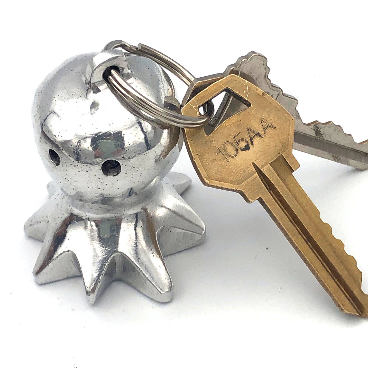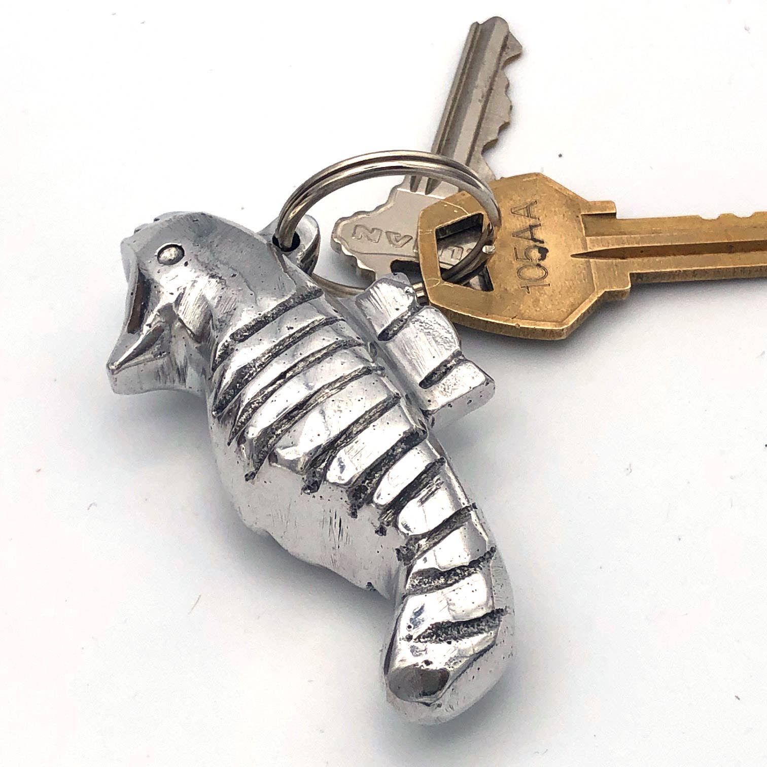 The molds for these unique keychains were carved by our balsa wood artisans on Isla Solentiname, Nicaragua and then the keychains were cast by our aluminum artisan partners. Using an age old sand-casting process, scrap aluminum is melted down with old car parts, then cast and polished to perfection. Approximate size: 3" x 1". Fair Trade.