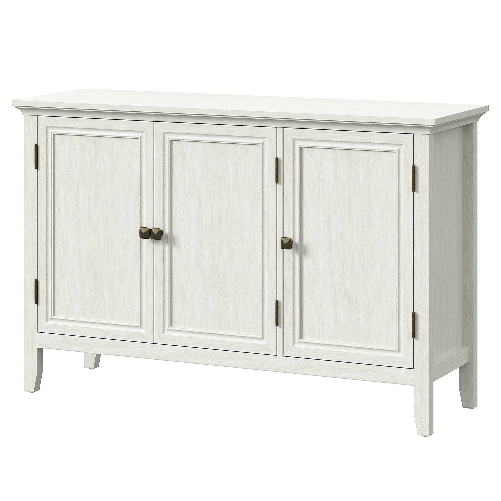 It features 2 barn-style doors with magnetic closures and 2 shelves behind the doors. Arrange priceless knick-knacks on top, and use the interior shelves to organize things you'd like to save for a later day! Thanks to its whitewashed finish, it will blend in with any style of furniture. Great as a coffee bar sitting in your dining room, a console table in the entryway, or a storage cabinet in your living room, bedroom or foyer. Specifications: Material: MDF, Metal, Fir, Magnet Weight: 32 lbs. Finish: Whitewashed Weight Capability: 150 lbs Easy to clean with soft cloth. Assembly is required. Package Included: 1 × Wood Carved Cabinet + 1 x Anti-tipping spare parts + 1x Assemble Instruction Specific Dimensions: Overall Dimensions: 31-1/4"W x 14-1/8"D x 32-1/4"H Door Dimension: 27-1/8"H x 14"W Cabinet Upper Part Storage Space Dimension: 29-3/4"W x 12"D x 13"H Cabinet Lower Half Storage Space Dimension: 29-3/4"W x 12"D x 14-3/4"H Leg Height: 2-3/8" H