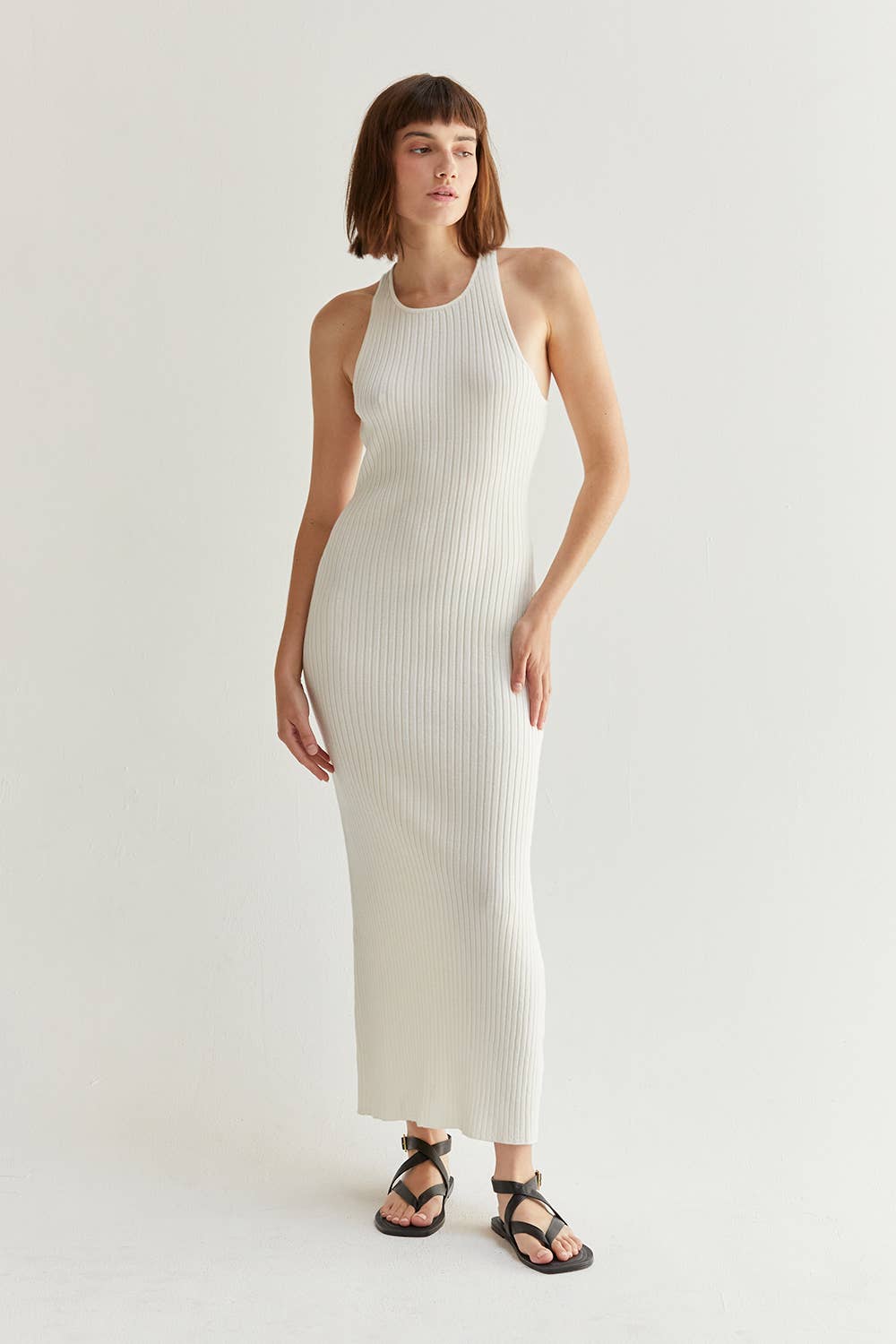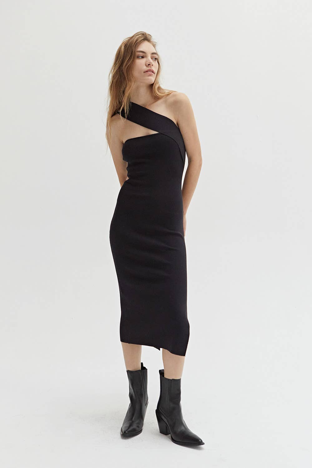 Rivera One Shoulder Cut-out Knit Dress SELF: 58% Viscose, 27% Polyester, 15% Nylon -One-shoulder style with long sleeve -O-ring detail waist cut-out accent -Midi length knitted dress -Fit to bodice silhouette -Imported Model height is 5'9" wearing a small size
