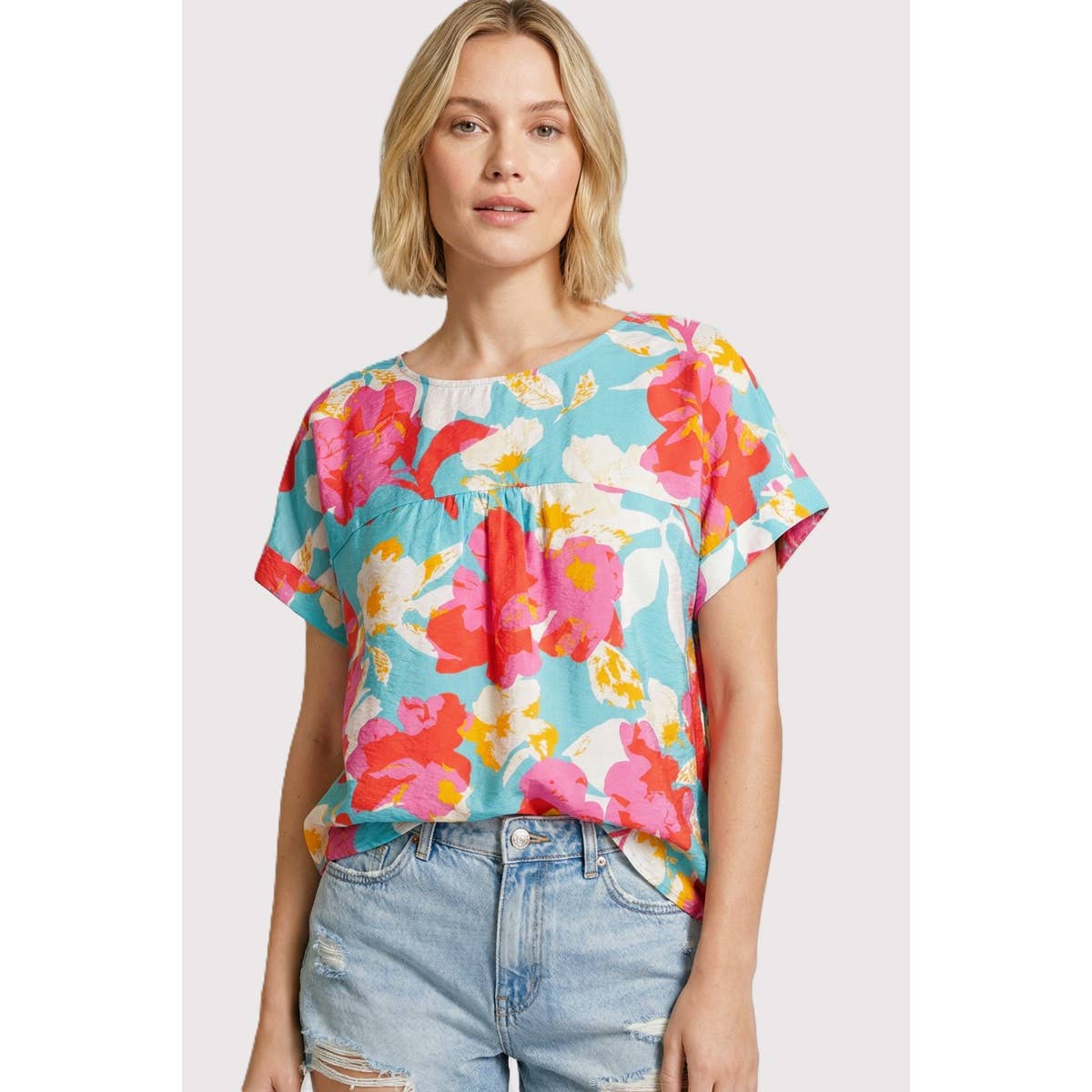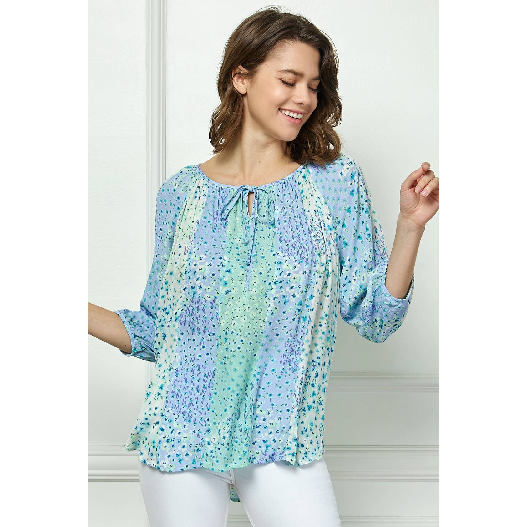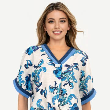 Like a t-shirt, but way cuter. Add some jazz to your wardrobe with this year round staple. Printed floral pleated knit tee with self-tie bottom. Pleated detail Ties at waist Pullover styling 100% Polyester