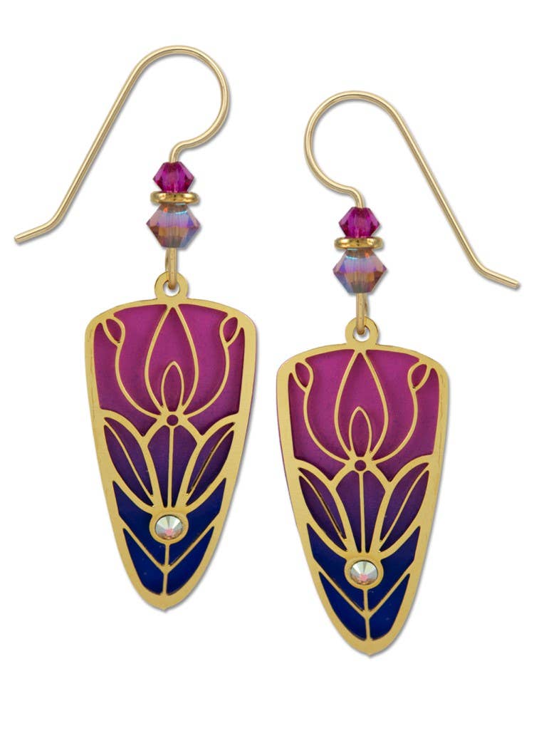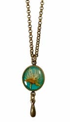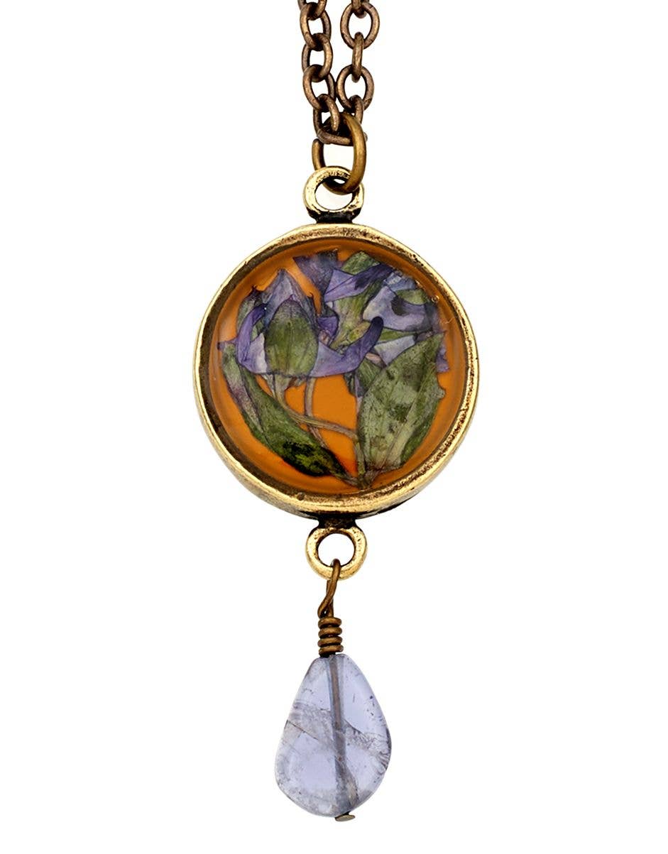 Actual Wildcat flowers grown in the Himalayan Mountains juxtaposed with a rich golden yellow set in antiqued brass plated pewter settings. Each centerpiece measures 3/4". Ear wires are antique brass. Drops as shown are genuine iolite but may vary due to availability.