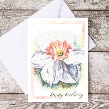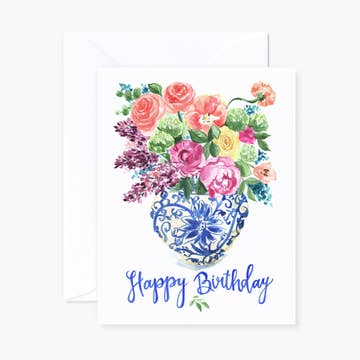 This floral card is a delight. Pansies are a favorite among all of us. Hand-painted touches of sparkling glitter have been added to accent the birthday greeting card. "Happy Birthday" is printed on the front of the 5" x 7" card. This card is made in the USA with environmentally-friendly materials. It comes pre-packaged with a white envelope, which requires standard postage to send. The inside is blank, leaving room for a custom message or photograph.