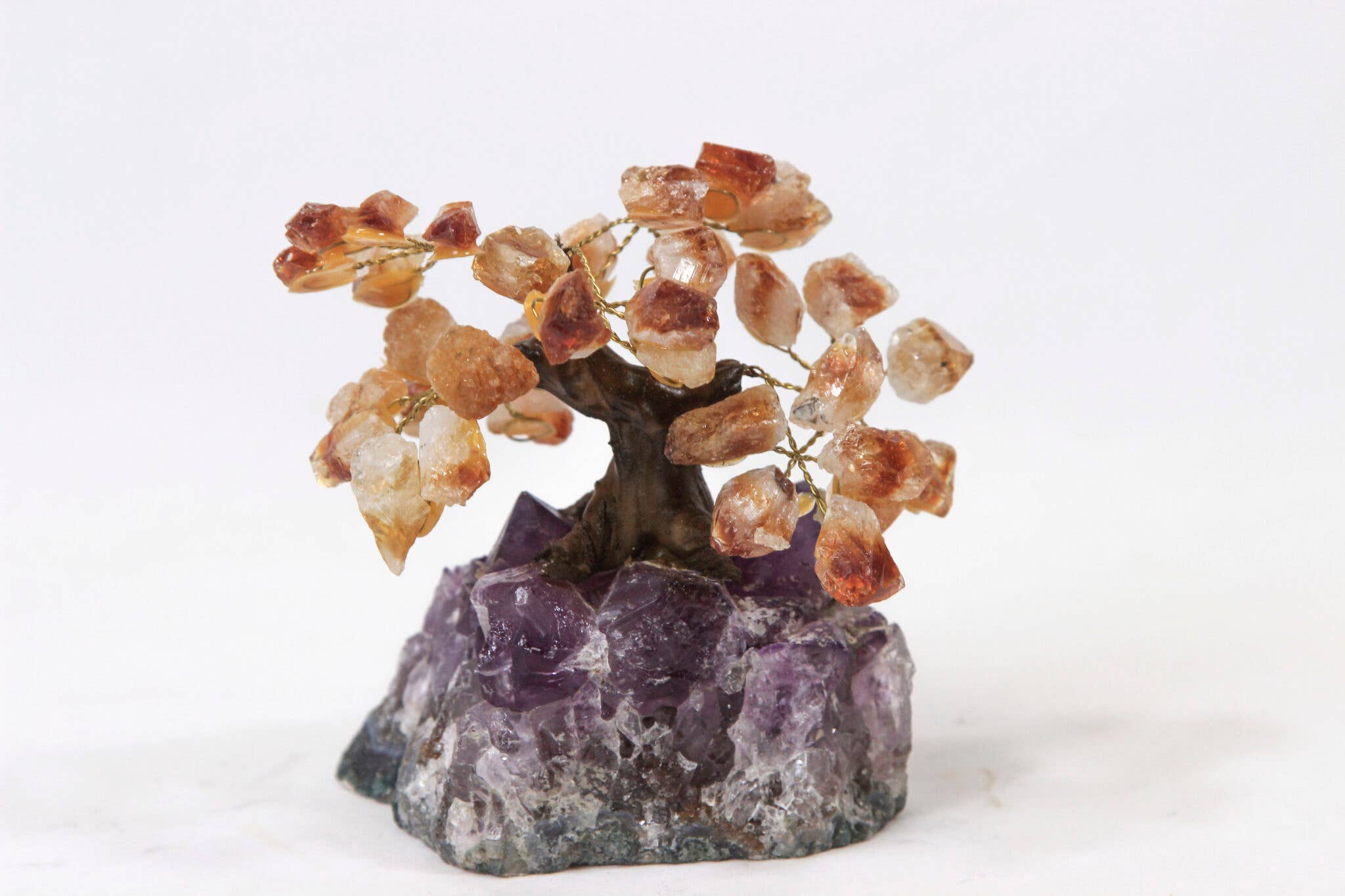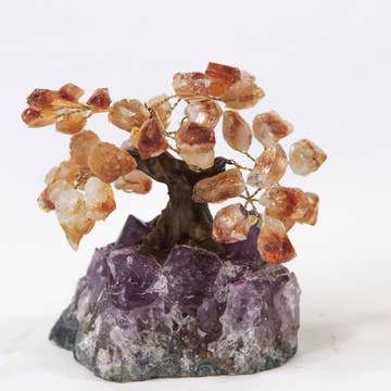 Listing is for ONE (1) Crystal Trees - Gemstone Crystal Trees with Crystal Stone Base STOCK PHOTO. These trees will vary in size and characteristics. Each one is different and we try to show you an assortment of shapes and sizes so you get an idea of the stock we have. These trees have an Rough Stone base with small Rough Stones as the leaves. The crystals are glued to wire branches so they can be molded and arranged as you wish. YOU CHOOSE: Sodalite Leaves on Sodalite Base Green Quartz Leaves on Crystal Quartz Base Amethyst Leaves on Amethyst Base Orchid Calcite Leaves on Orchid Calcite Base Green Quartz Leaves on Amethyst Base Green Quartz Leaves on Green Quartz Base Crystal Quartz Leaves on Crystal Quartz Base Base is Approx.: 2-3.5" x 2-3" whole tree is approx. : 3-4" Tall Grab these while they last!