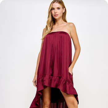 GARNET SLEEVELESS RUFFLED HEM SATIN MINI DRESS