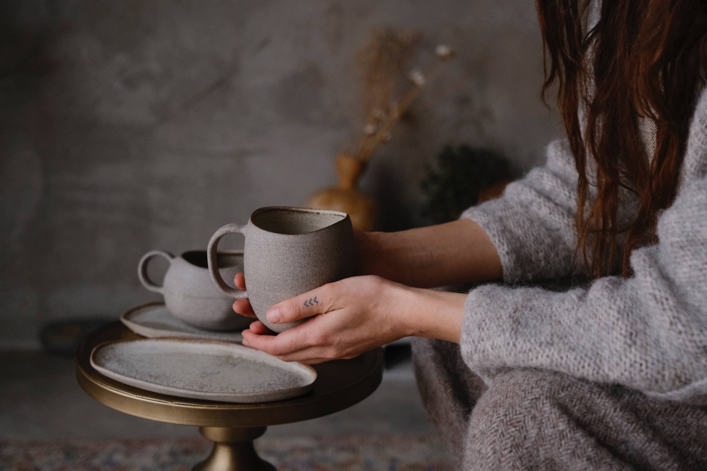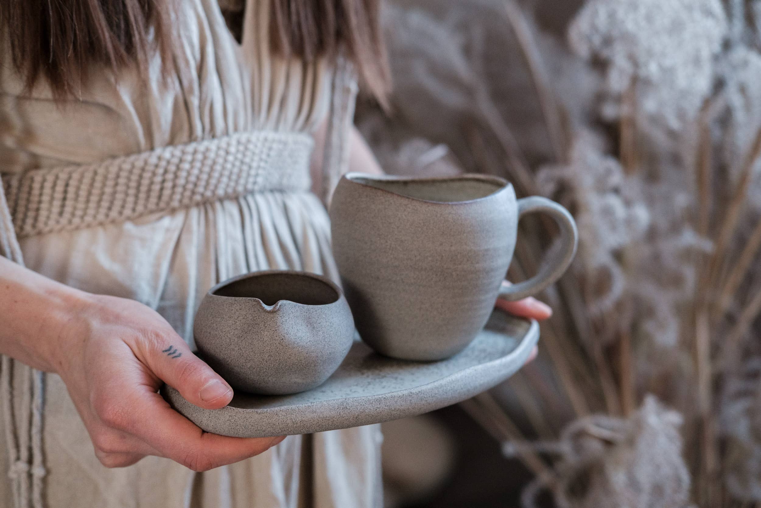 These minimal stoneware cups belong to our enduring STONE Collection — a range that honours raw earth, quiet simplicity, and the beauty of organic imperfection. A collection defined by softly asymmetric silhouettes, grounded forms, and a raw hand-polished exterior that feels like holding a small river stone. The STABILITY form draws from winter silhouettes: a shape that widens at the base and gently narrows toward the top. This creates a vessel that feels steady, rooted, and reassuring — its softly narrowed opening holding warmth close, perfect for cold mornings and contemplative pauses. Handmade from natural grey stoneware and high-fired, each mug becomes non-porous, strong, and ready for everyday use or restaurant setting. The exterior remains raw and vitrified: earthy, honest, softly textured. Inside, a beige crystalline glaze moves between matte and gloss — pooling gently where thick, revealing warm clay tones were thin. A subtle, living surface that echoes ash-fired aesthetics and the slow passage of time. The rounded, grounding shape rests naturally in the palms — bringing a comforting sense of calm to every sip. Capacity: 400 ml (≈ 15 fl oz) Price: per single mug Recommended pairing: A matching plate DUNE or CLASSIC works beautifully as a saucer for mindful tea or coffee rituals. Each mug is individually shaped and glazed, so no two are ever exactly the same. Expect natural variations in tone, texture, and quiet irregularities in form — the hallmark of handmade work. 🔥 Material & Durability High-fired to 1260°C, the stoneware becomes dense, vitrified, and non-porous — built for everyday use while retaining its earthy, tactile presence. The glazes are lead- and cadmium-free, and the pieces are fully dishwasher safe for ease in daily ritual. A grounding, winter-warm mug — steady in form, calming in presence, and deeply rooted in the poetry of slow living. Made to order — please allow 4–12 weeks making time. Thank you for supporting slow, mindful craftsmanship and women-led studio. Follow our journey and meet the hands behind the pieces at @laimaceramics 🤍