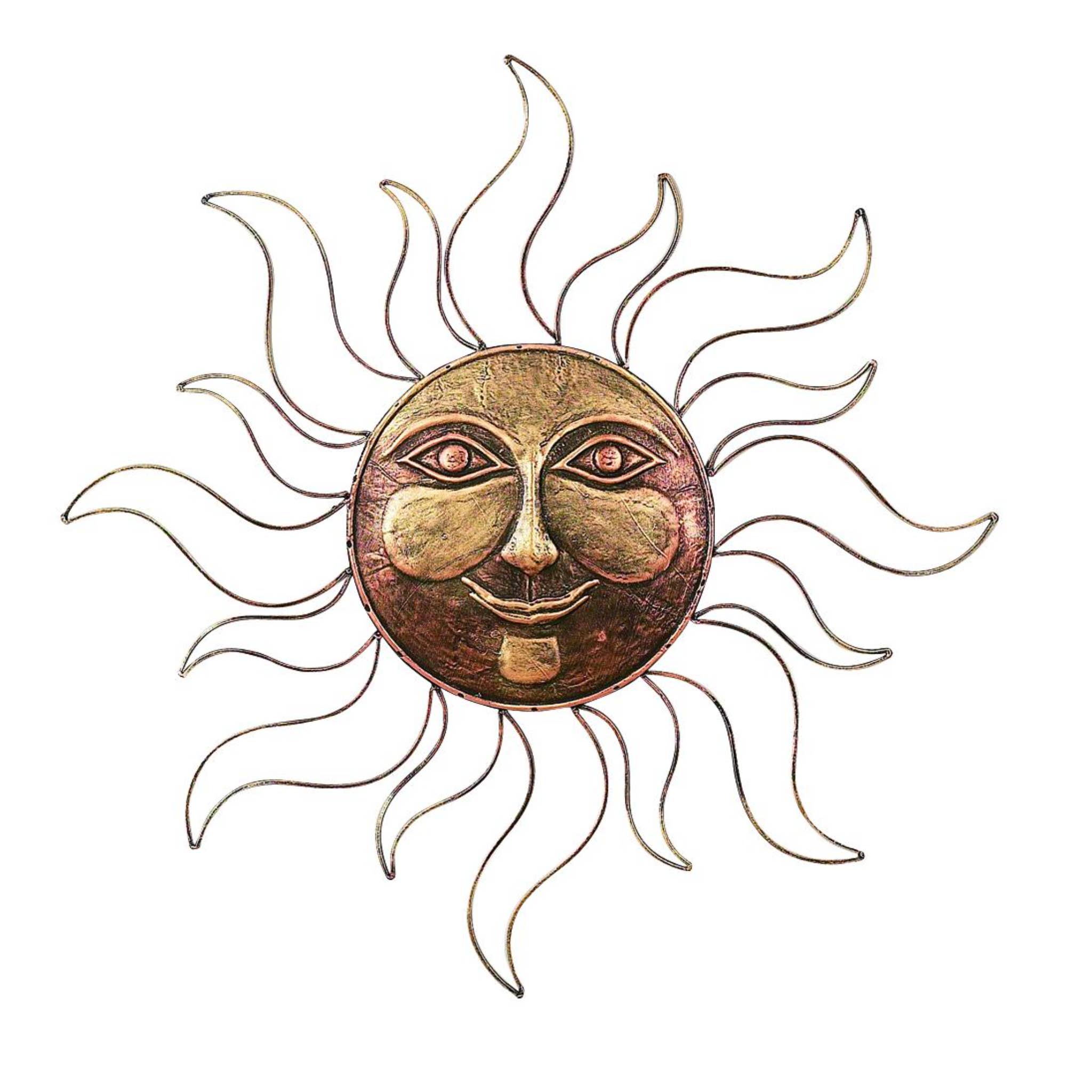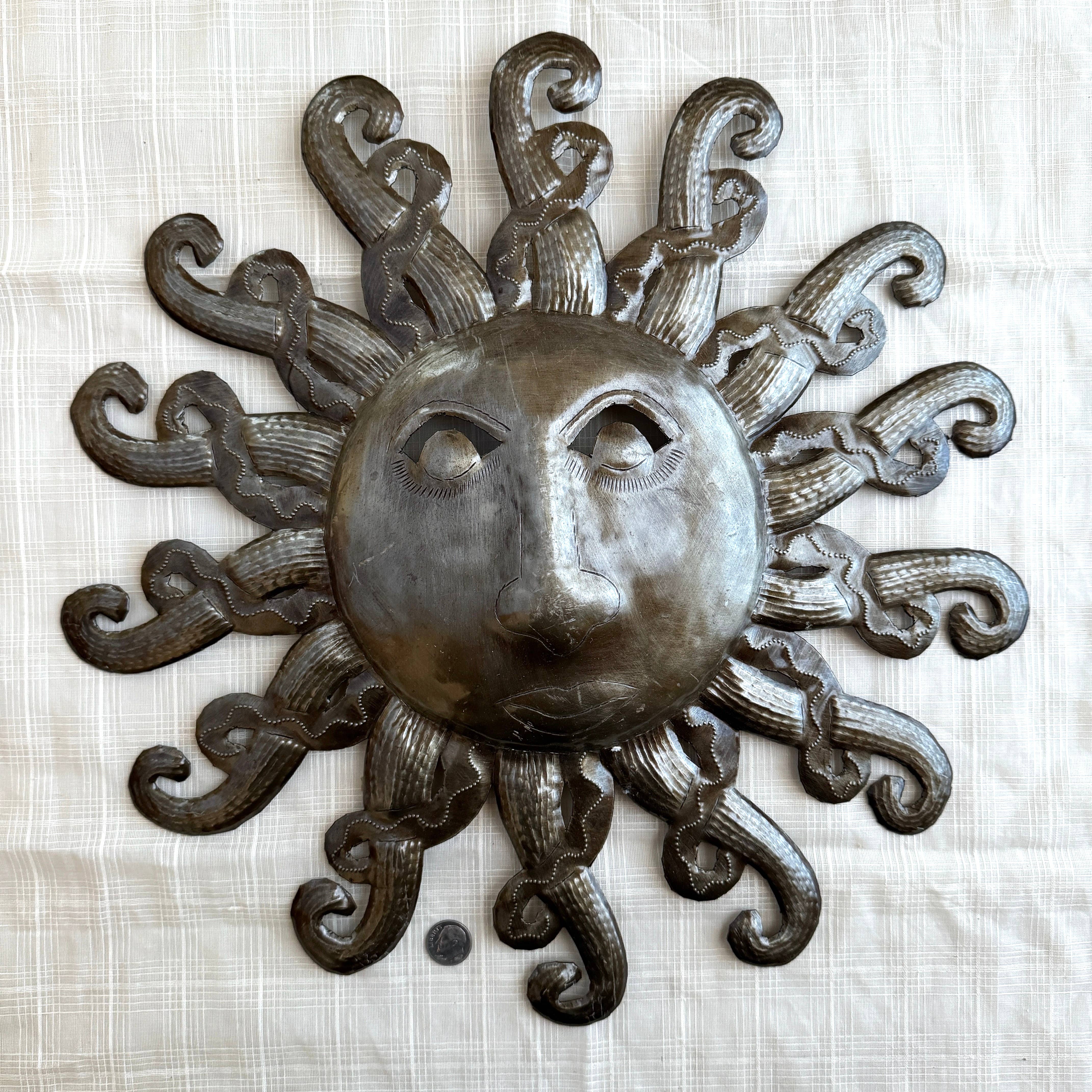 Crafted from recycled 55 gallon steel drums by village artisans in Haiti, these stunning pieces of art are truly one of a kind. The process of turning sheets of metal into beautiful art is all done by hand. Steel drums used to transport oil into the capital of Haiti are cut, the oil is burned off to clean the metal, and then flattened in order to create stunning, up-cycled art. Suitable for indoor or outdoor use.  Type: metal wall art . Colors: metallic. Materials: up-cycled steel metal. Finish: lacquer. Dimensions: approx. 10" diameter. Care: if displaying outdoors it is recommended to spray with a clear lacquer once or twice a year, as prolonged exposure to the elements will cause rust. Hanging instructions: to hang metal art simply use pin head nails in the many nooks and spaces available in the design. If nails are shiny, you may want to darken heads with a black marker to help nails visually disappear.Keywords: summer, gifts, home décor, outdoor, garden,sun