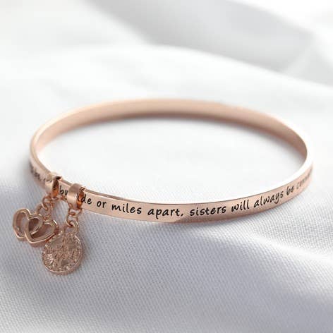 Rose gold bangle with special wording. With two free moving charms. Made of rose gold plated brass. Embossed 'nana' quote.