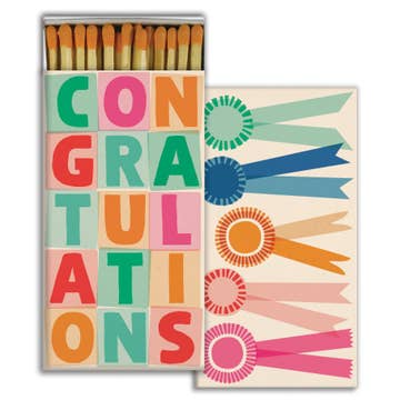 2 3/8" x 2 3/8" x 3/4 matchbox containing 80 black or natural wood matchsticks with coordinating color tips. *See our cube display with best-seller assortment under 'collections.' Matchboxes are not available in the UK or EU. All cards are made in the USA, and we work with overseas partners to produce our other products. Candles, Congratulations, Celebration, Birthday, Inspirational, Quotations, Quotes, Motivational, Positive, Gift, Engagement, Novelty