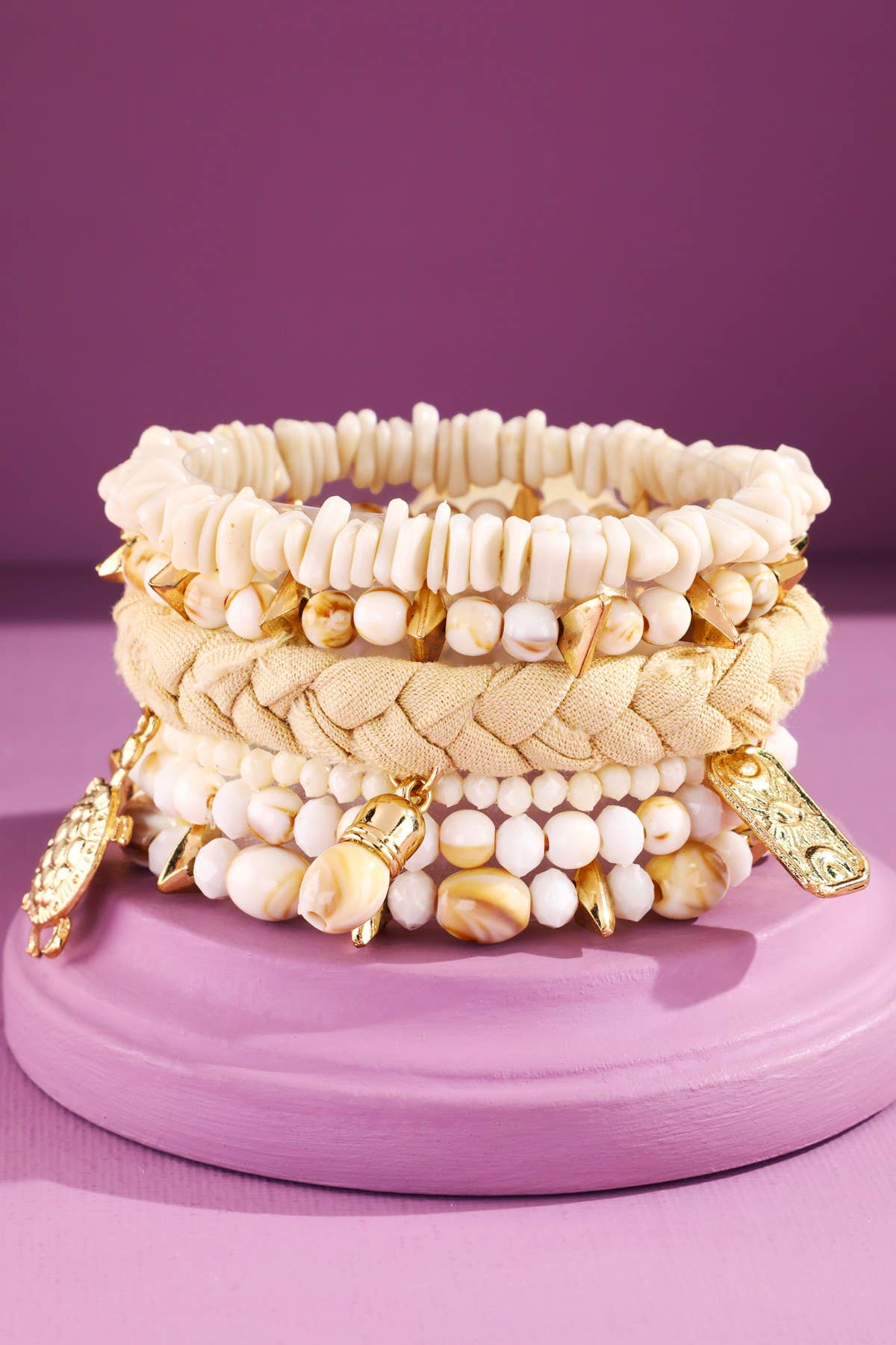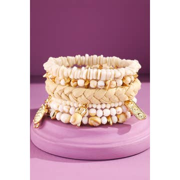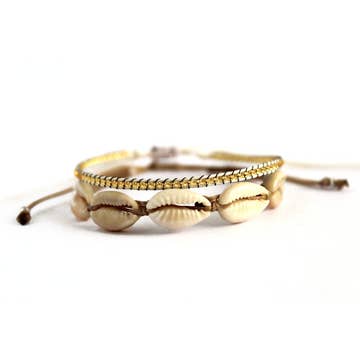 This bracelet 2 pack features one hand woven hand loom seed bead bracelet and one macrame cowrie shell bracelet. Colour: natural beige. Free size.