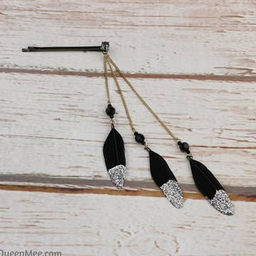 Feather Hair Clips fit for a Superstar Sold as a pair; these feather hair clips are fit for a superstar, with gorgeous, sparkling glitter detailing. The antiqued silver hairpins are set with a sparkling diamante, and the feathers are hung on luxury gold chains, and topped with a black crystal. They are a feather hair accessory you could wear to a London wedding, which would also ooze laid back glamour at Glastonbury. Feather Hair Clips with a Glittery Edge This set of two feather hair clips is beautifully made, with hair jewellery detailing – the finish on the silver hair pins and the gold chains is plated to jewellery standards, and the mix of metallics means that these feather hair pins will work with a wide range of outfits.
