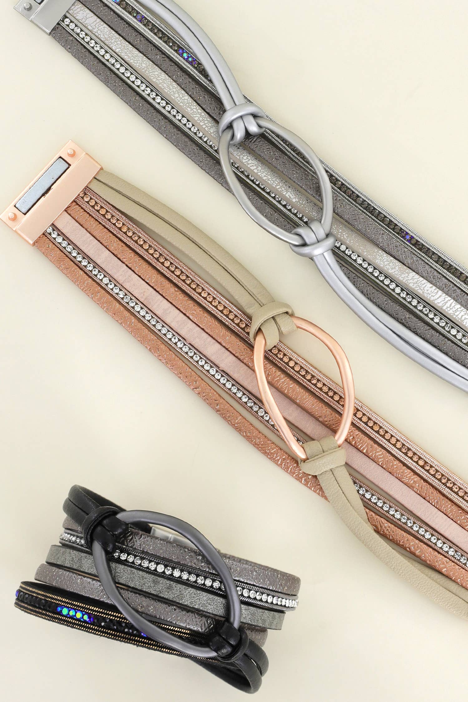 This beautifully designed collection is a company favorite. Made of soft vegan leather in rich warm colors, these bracelets are quick and easy to put on and take off with their magnetic clasp. Super stylish and well made! We love them.