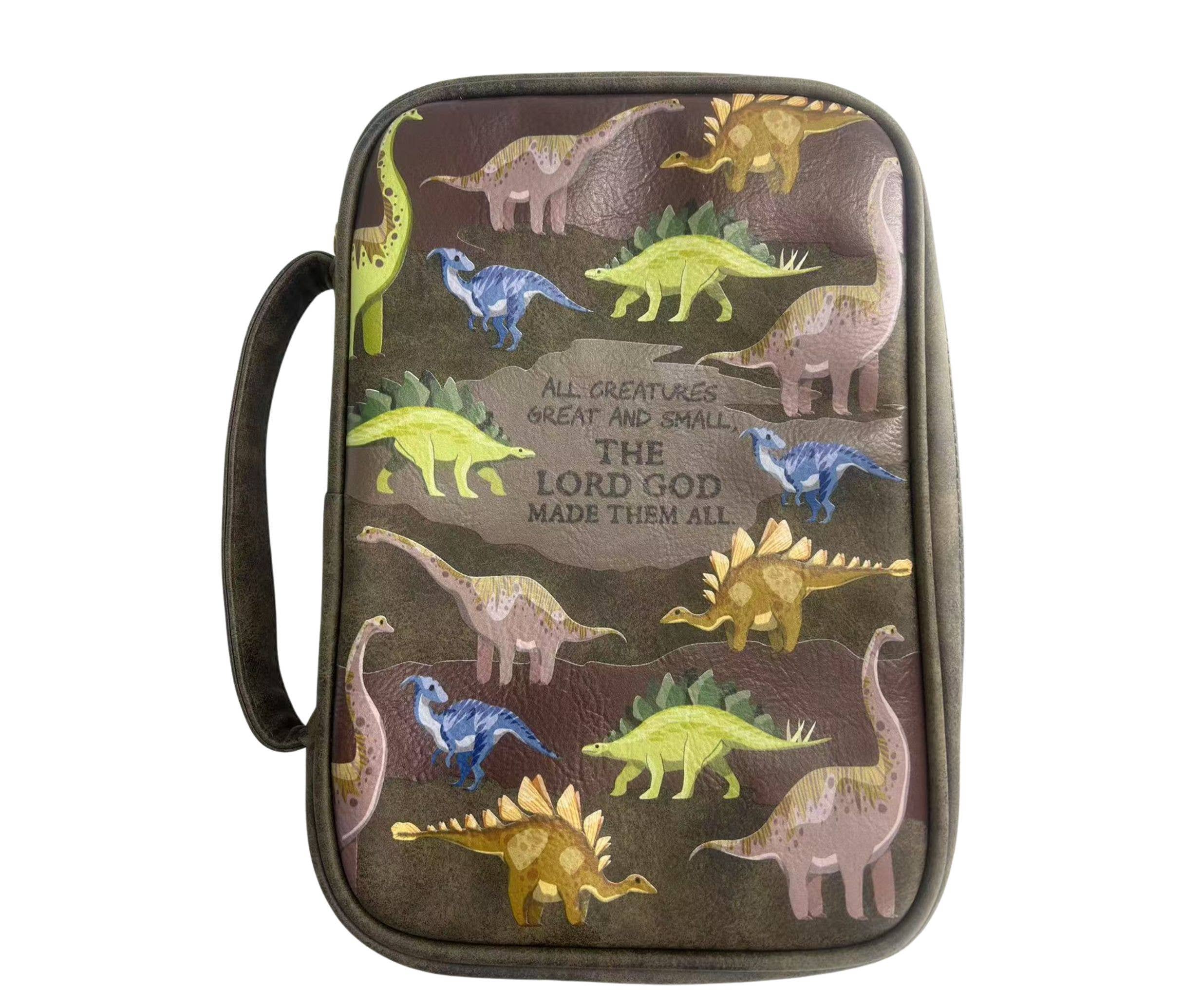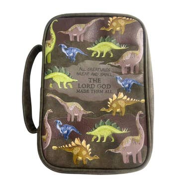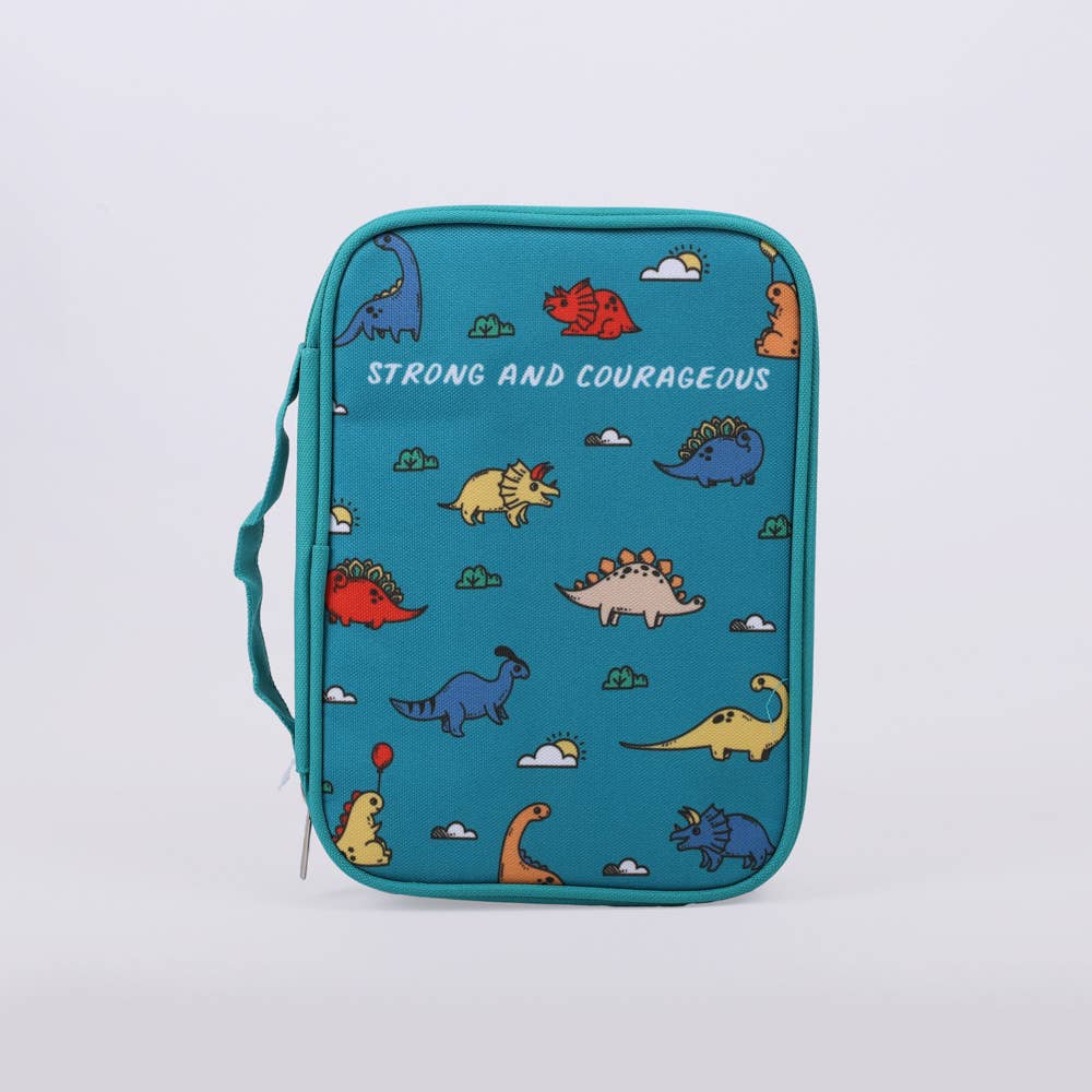 Help kids carry their Bible with confidence and joy using the Strong and Courageous Dinosaur Bible Cover in large size. Designed with a bright blue background covered in playful dinosaurs, this fun and faith-building cover encourages young believers to remember that God’s strength goes with them everywhere they go. With its bold “Strong and Courageous” message, it’s the perfect blend of encouragement and imagination for active, adventure-loving kids. Crafted from durable canvas, this cover offers long-lasting protection from daily bumps, spills, and wear—ideal for Sunday School, VBS, midweek classes, and family devotion time. Sized to fit most large Bibles, it keeps everything neatly in place with interior organizational features that make Bible study easy and enjoyable. A smooth zipper closure ensures their Bible stays secure, while built-in bookmarks help kids keep track of memory verses or reading assignments. Interior pockets hold notes or devotionals, and a pen loop keeps a writing tool close at hand for highlighting or journaling. Whether you’re choosing a birthday gift, a baptism keepsake, or a milestone reward, this Bible cover is both practical and inspiring. It supports a child’s spiritual growth while tapping into their creativity and curiosity—making it a meaningful accessory they’ll love to carry. Key Features:· Bright dinosaur-themed design with “Strong and Courageous” message· Durable canvas construction with smooth zipper closure· Built-in bookmarks for easy scripture tracking· Interior pockets and pen loop for organization· Large size fits most children’s Bibles Item dimensions without packaging: 7" L x 1.875" W x 10.125" HItem weight without packaging: Durable lightweight canvas Not sure what size you need for your Bible? Watch this helpful guide on how to measure your Bible for the perfect cover fit. Collection Reference: Explore more faith-inspired designs in our Canvas Bible Cover Collection — where practicality meets devotion.