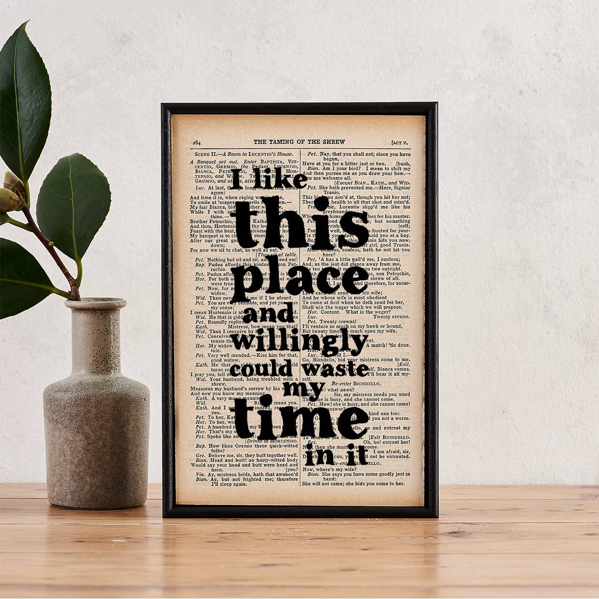 A romantic quote from Shakespeare about love printed in our hand drawn font. Framed with ethically sourced wood by our talented framers. Play pages are chosen at random. Perfect for book lovers, bookworms, readers, bibliophiles, bookshops and bookstores. A wonderful Valentines Day Gift. "I would not wish any companion in the world but you." - no glass - lightweight frames made from wood from sustainably managed forests - available in packs of four - can hang neat to the wall or stand freely Frames are handmade in-house in the UK. Â The pages measure approx 14cm x 20cm (5.5 inches x 8 inches) They're 3cm deep with 0.3cm of black frame border.