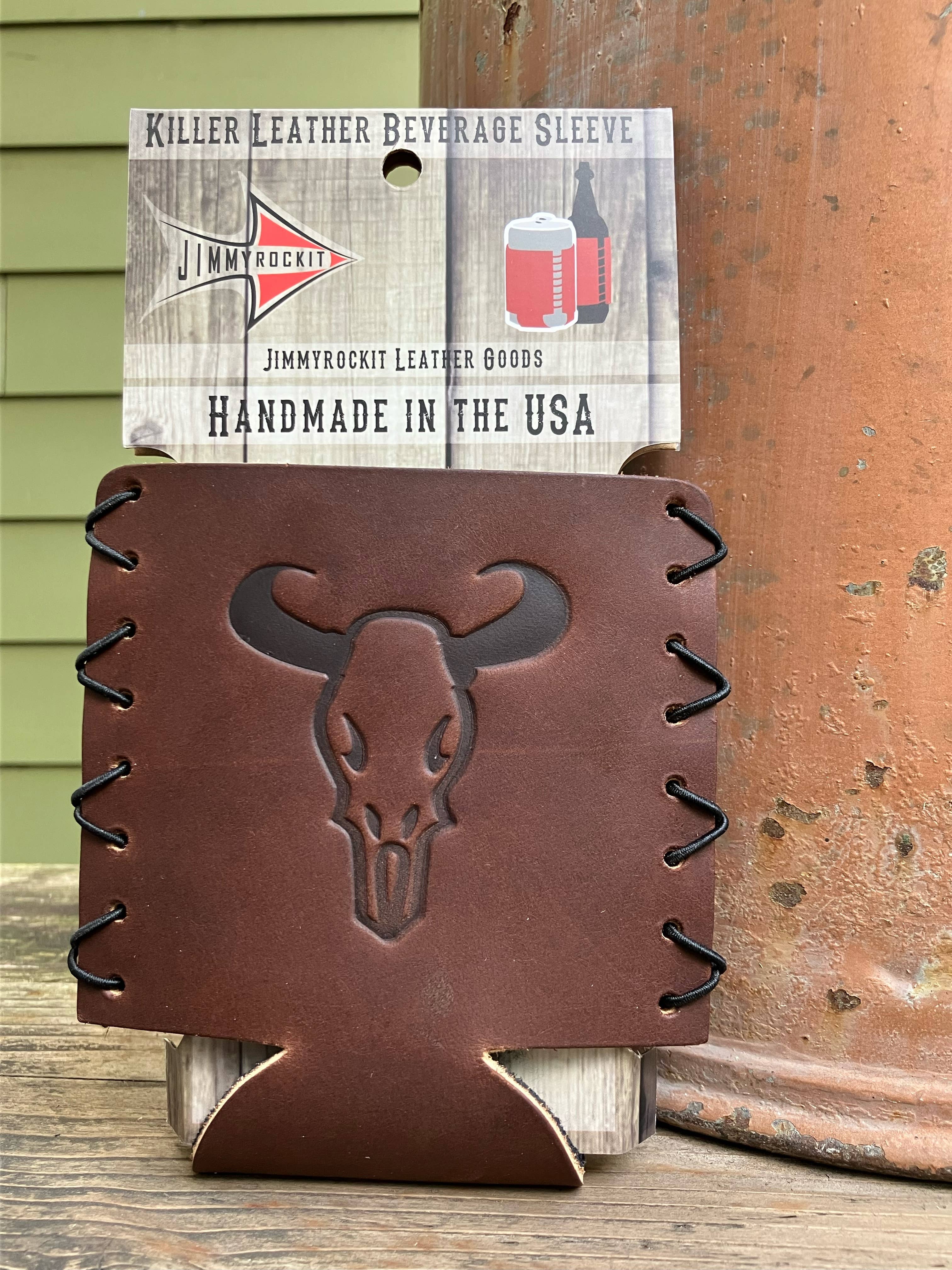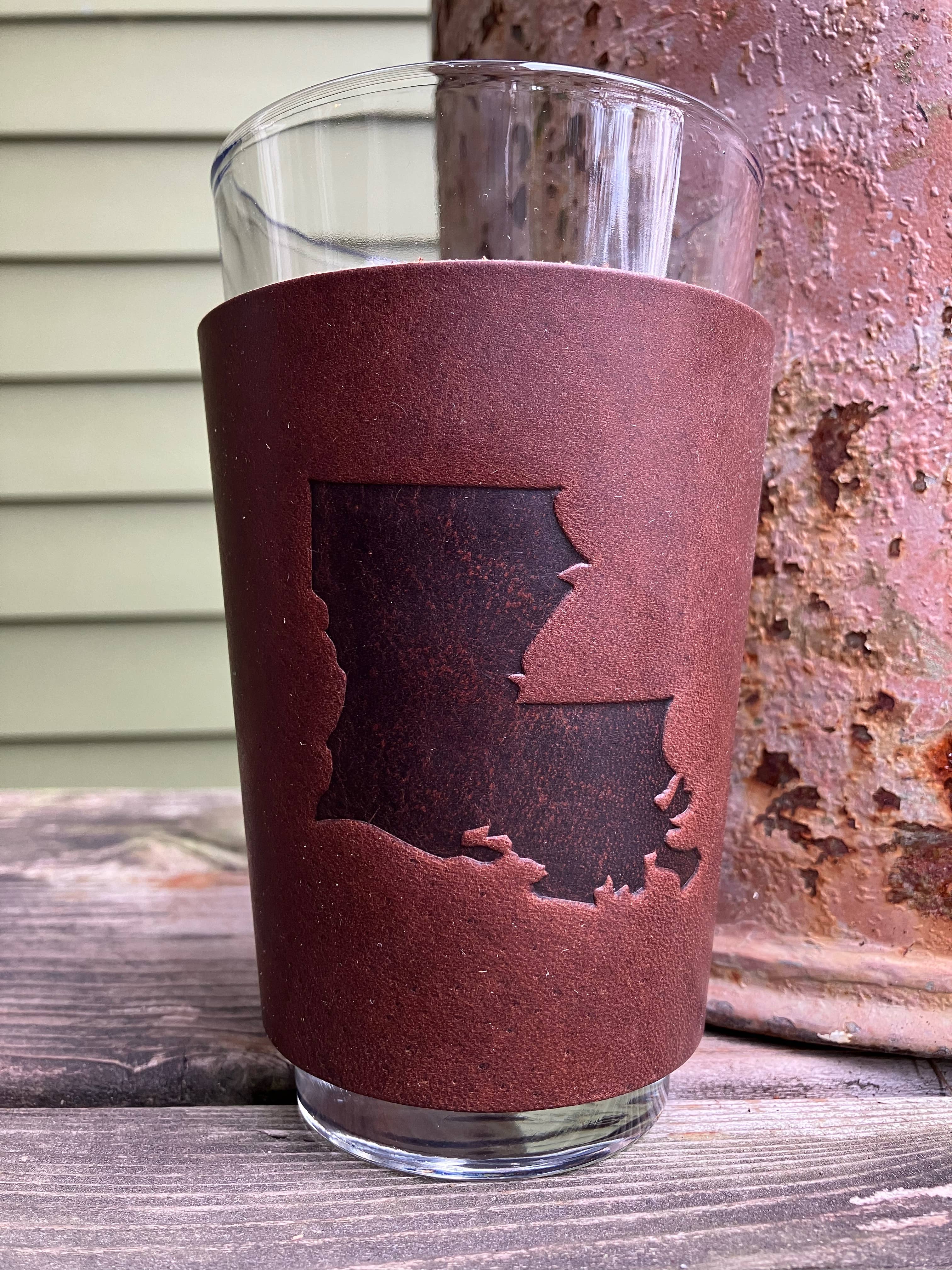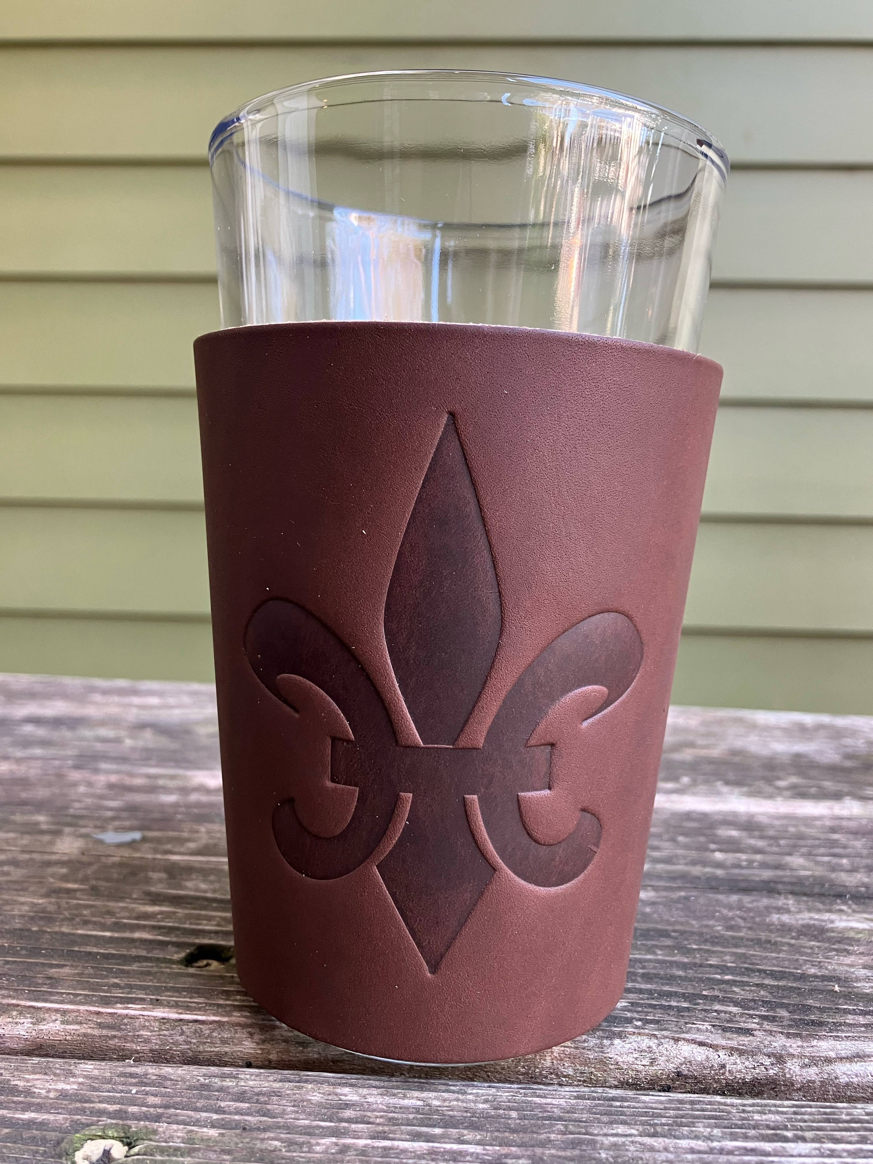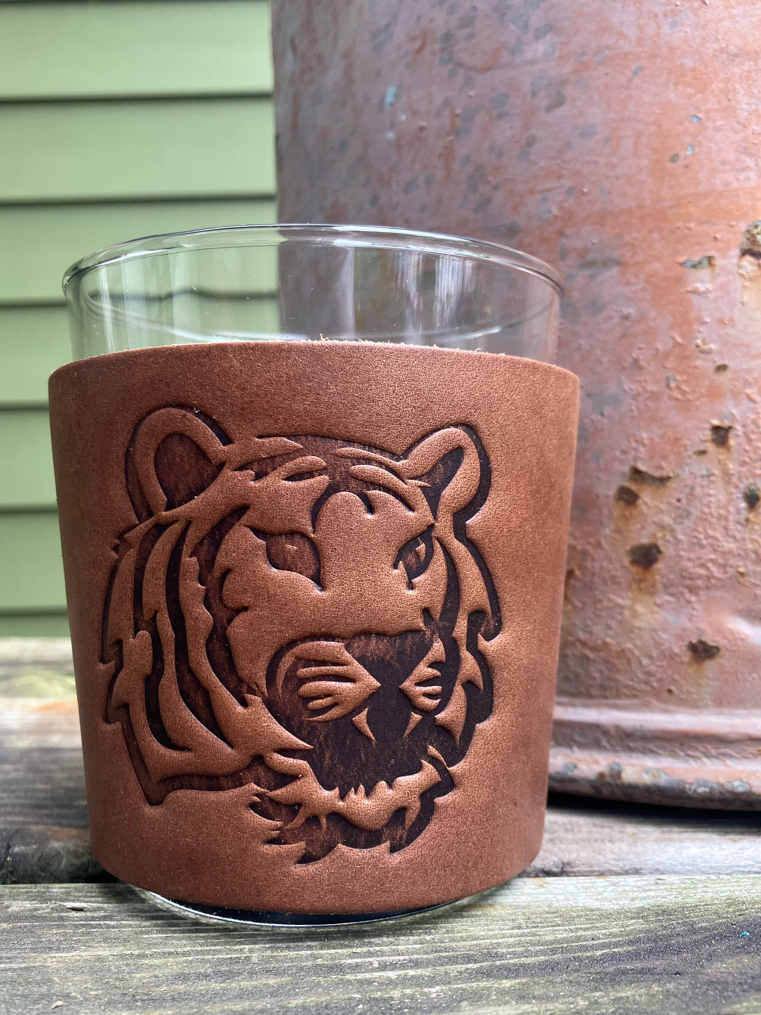 Beer Glass - Tiger A 16 ounce thick bottomed pint mixing glass with neoprene insulated leather sleeve. Our leather beer sleeves wrap around the glass and snap together with 3 vertical snaps. Stamped with one of our stock designs or a custom design.
