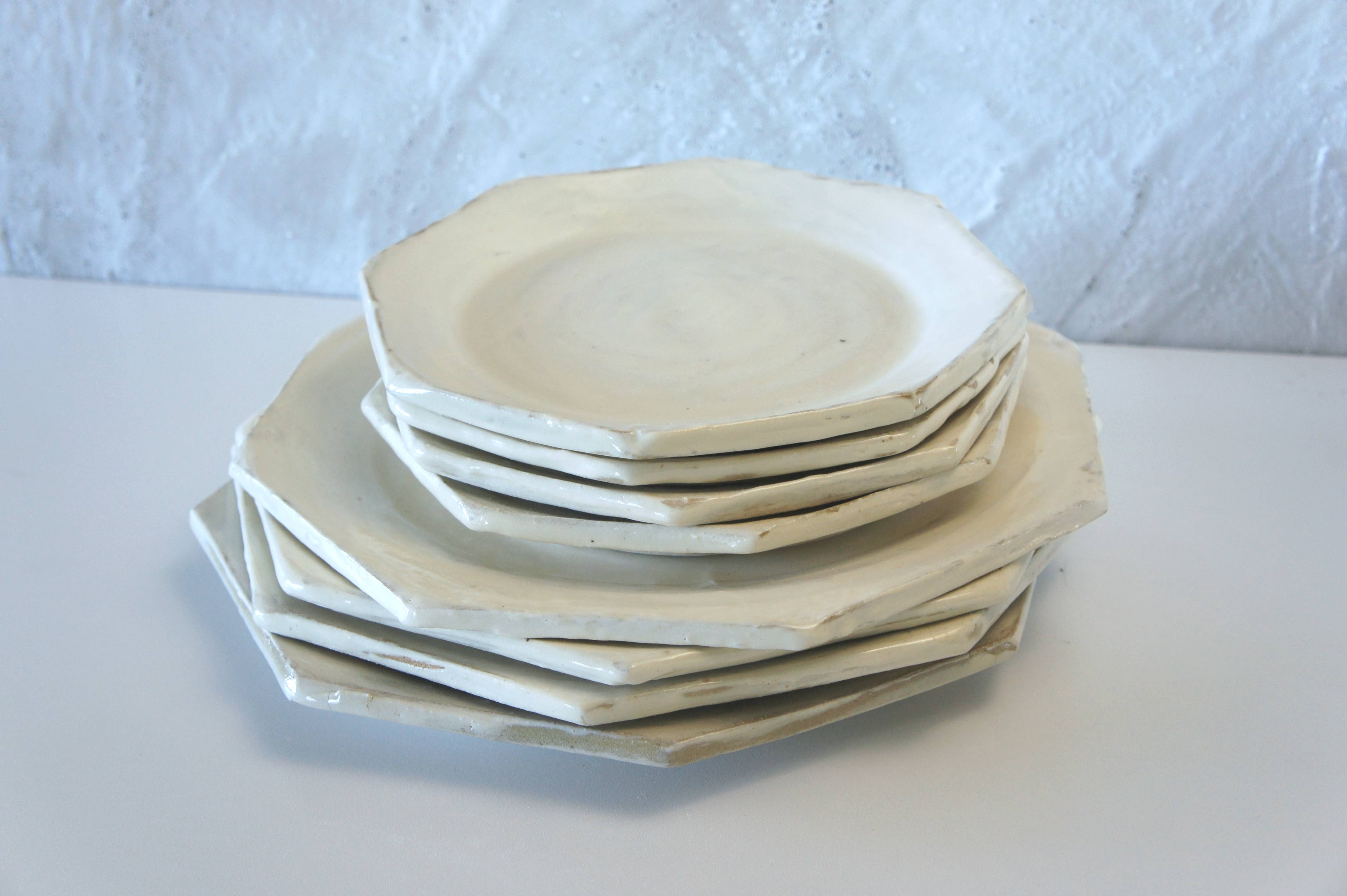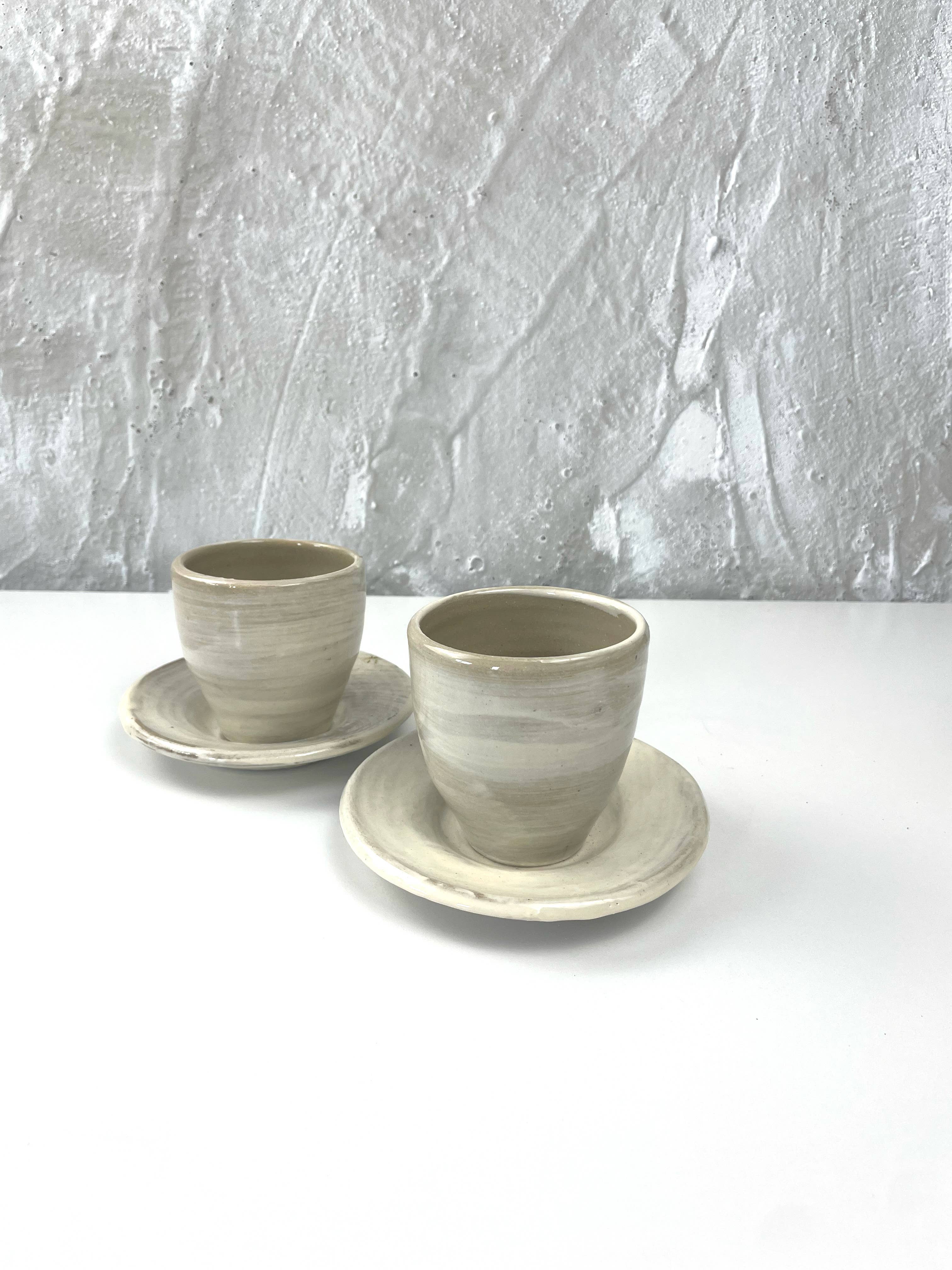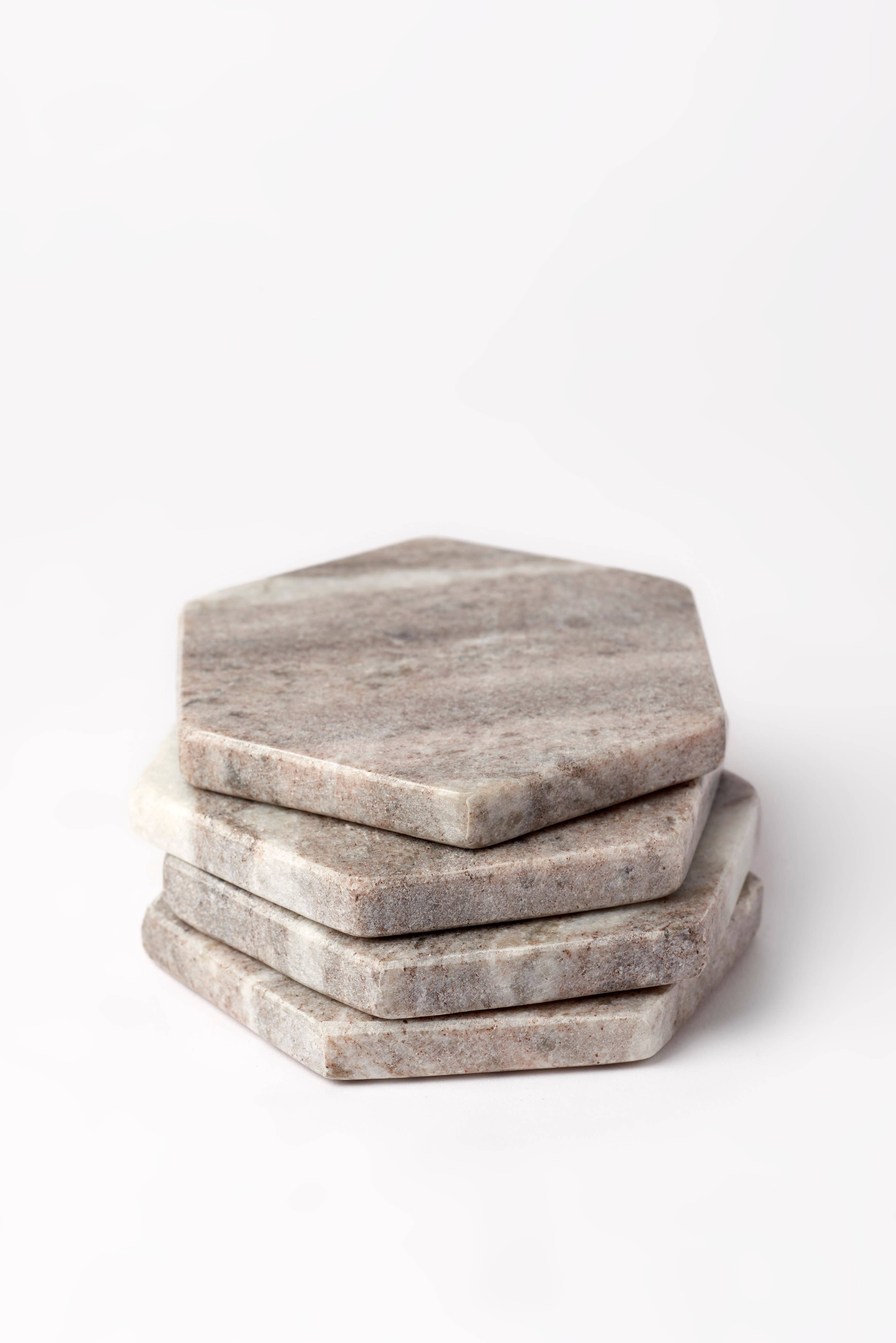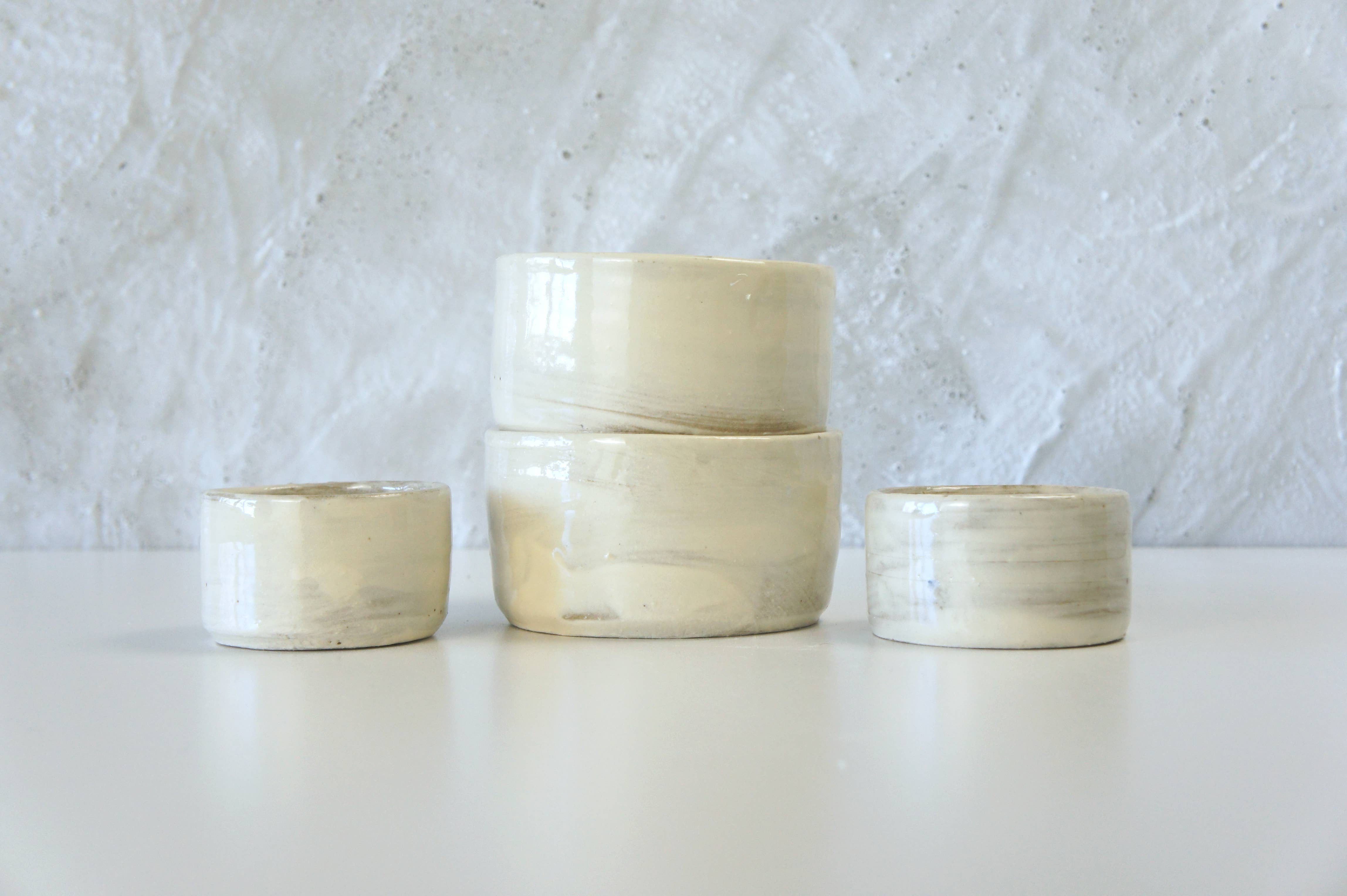 These handmade white coasters are a part of our Hakeme Collection. This collection is inspired by traditional Japanese techniques, bringing the beauty of the past into a modern home. Neutral colors and classic forms create a minimalist design, while the unique glaze brushwork brings interest. Together, they create a subtle Japandi style in your home. These coasters are stylish but subtle, making them a perfect accent for a coffee table or desk. A thin cork lining gives them a nice cushion on the table, keeping your surfaces safe! Not only are they stylish, they're also celebrating a part of ceramic history! Hakeme means "brush stroke" in Japanese, but the technique was used by both Japanese and Korean potters. By taking a dark clay and painting expensive white porcelain clay on top, they created a style that is more interesting than porcelain alone. The white and dark contrasts beautifully, and the wild brush stokes make every piece unique.