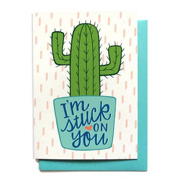 FRONT: I'm stuck on you INSIDE: blank DETAILS: • Dimensions - one 5x7 folded card • Paper - 100# natural cardstock, 100% recycled • Envelope - aqua recycled envelope (A7) • Packaging - sealed in a clear sleeve
