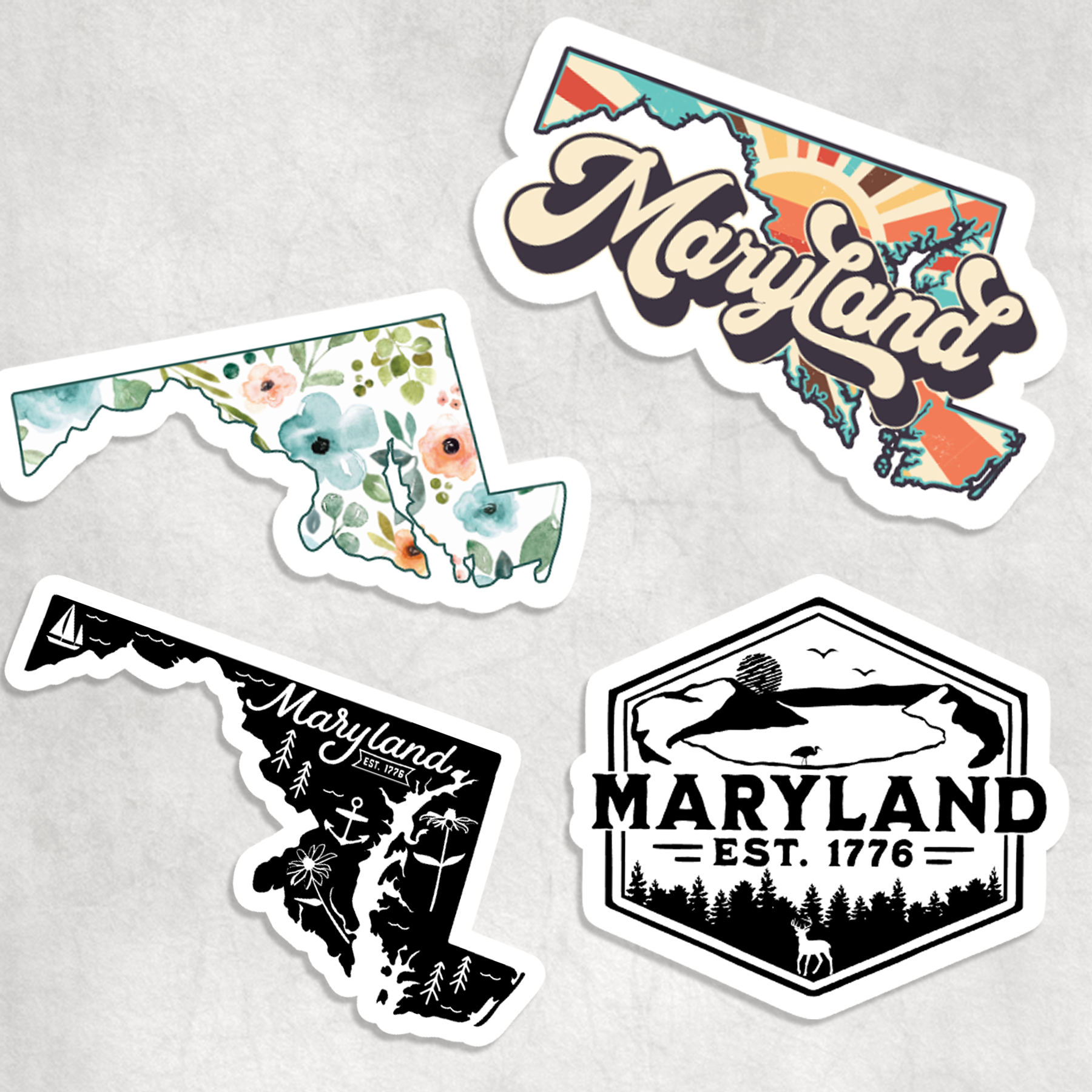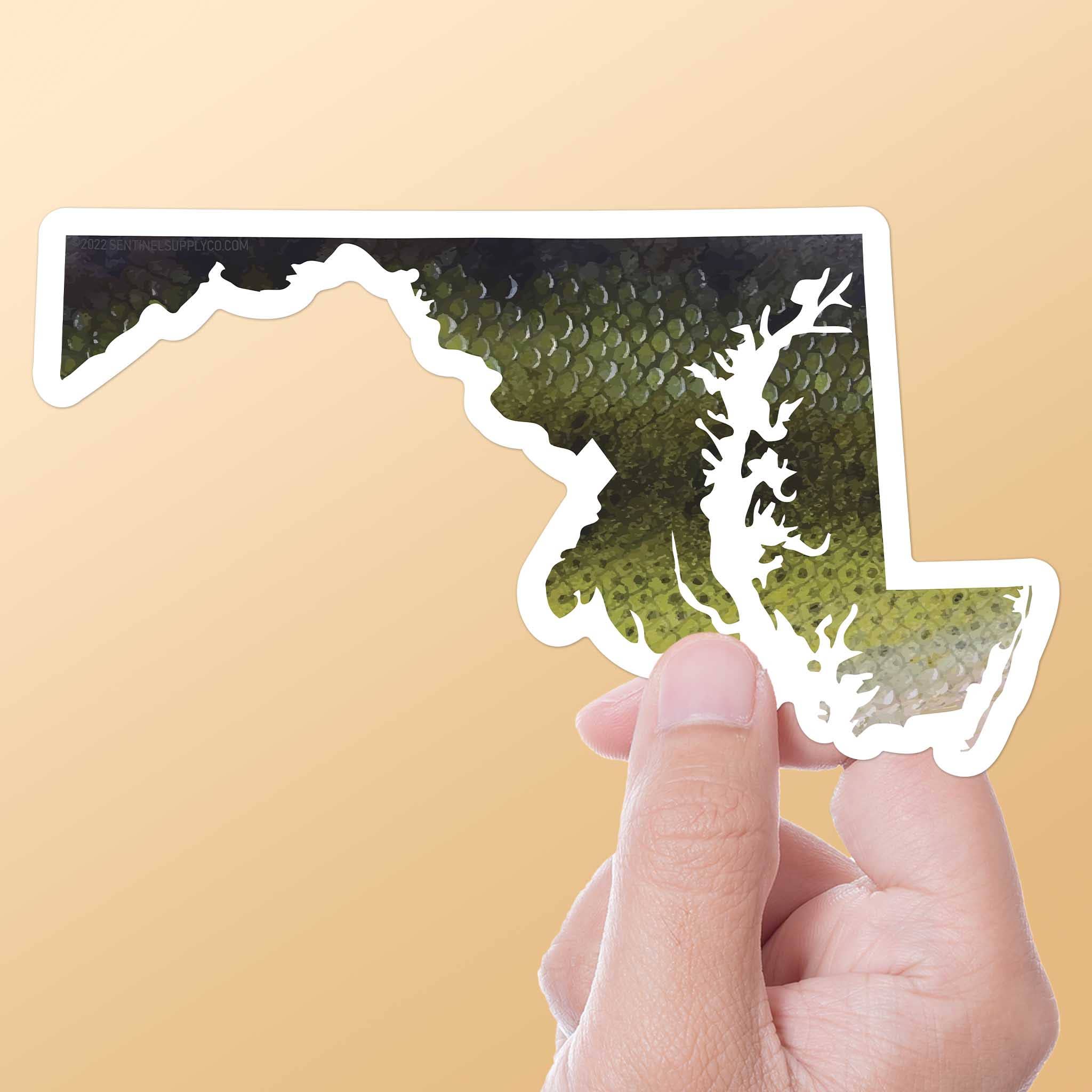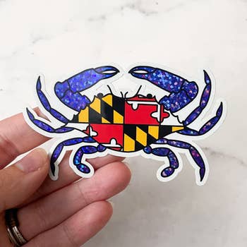 Maryland crab sticker, 3" laptop decal size. Durable die-cut vinyl decal with a matte UV-resistant coating. Waterproof & weatherproof for indoor & outdoor use. Made in USA. Perfect for a Maryland gift shop, tackle shop, or surf shop on the beach. Show off your Maryland pride with a MD state flag crab sticker! The Atlantic blue crab is a Chesapeake Bay icon, a world-famous seafood staple. This dark grey Maryland bumper sticker features the outline of a jumbo crab in the Maryland flag colors. A Chesapeake Bay crab decal is a perfect Maryland souvenir whether you're a lifelong resident, recent transplant, or just visiting for the crab cakes. Place this cute Maryland sticker on your car, truck, cooler, or tackle box. Great waterproof decal for Hydroflask water bottles, drink tumblers, insulated mugs, & thermoses.