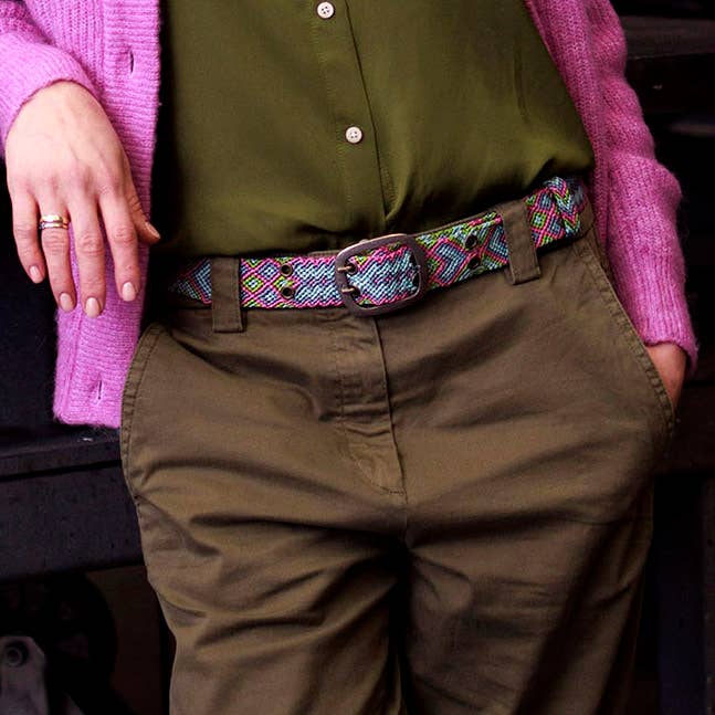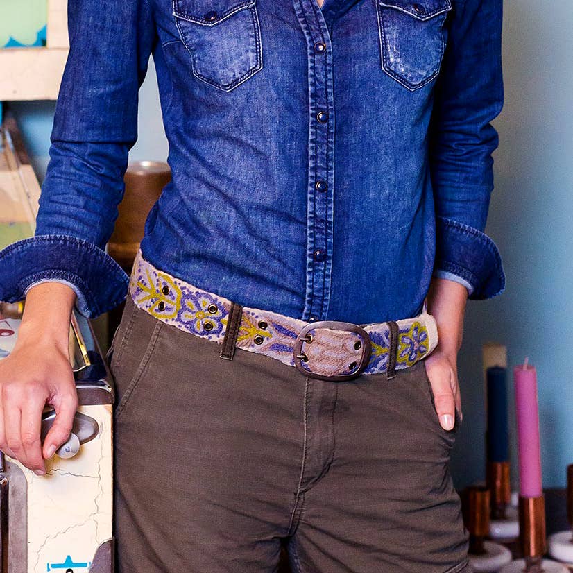 These enchanting little flowers, almost plastically hand-embroidered, and the beautiful colors make this belt a very special accessory. Handmade in Peru. Sizes: S = approx. 75 cm long, M = approx. 85 cm long, L = approx. 95 cm long (measurements are from the buckle to the middle belt hole, each belt has 5 holes spaced approx. 4.3 cm apart), Width: approx. 4.3 cm, Material: 100% wool.