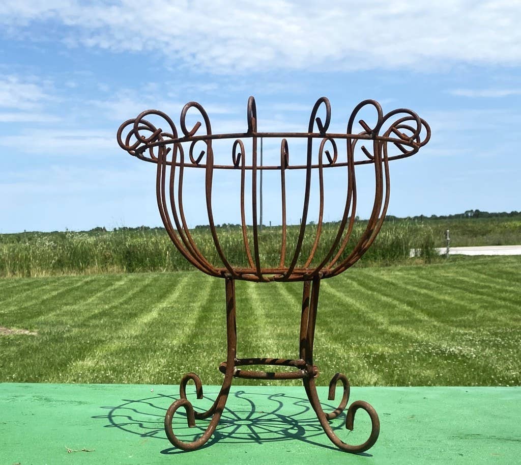 Solid Iron Basket with Unique Twisted Strap Solid Iron Legs. A favorite of mine in store displays or a porch. Perfect size on a table or beside the checkout counter. Heavy enough for the wind not to blow it perfect size for a furn. It looks sharp in all colors. This egg basket on legs is copied from an antique one that didn't even stand up. This one is made out of heavier material than the original one that we found to copy. Order this planter today to get it to more homes around the world. Dimension: 30.5" tall by 16" diameter X 7.5" deep. Down at the feet is 16" wide.